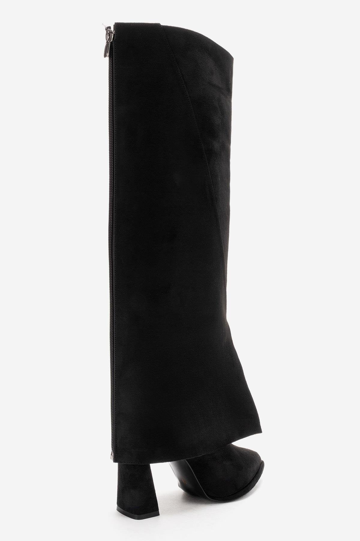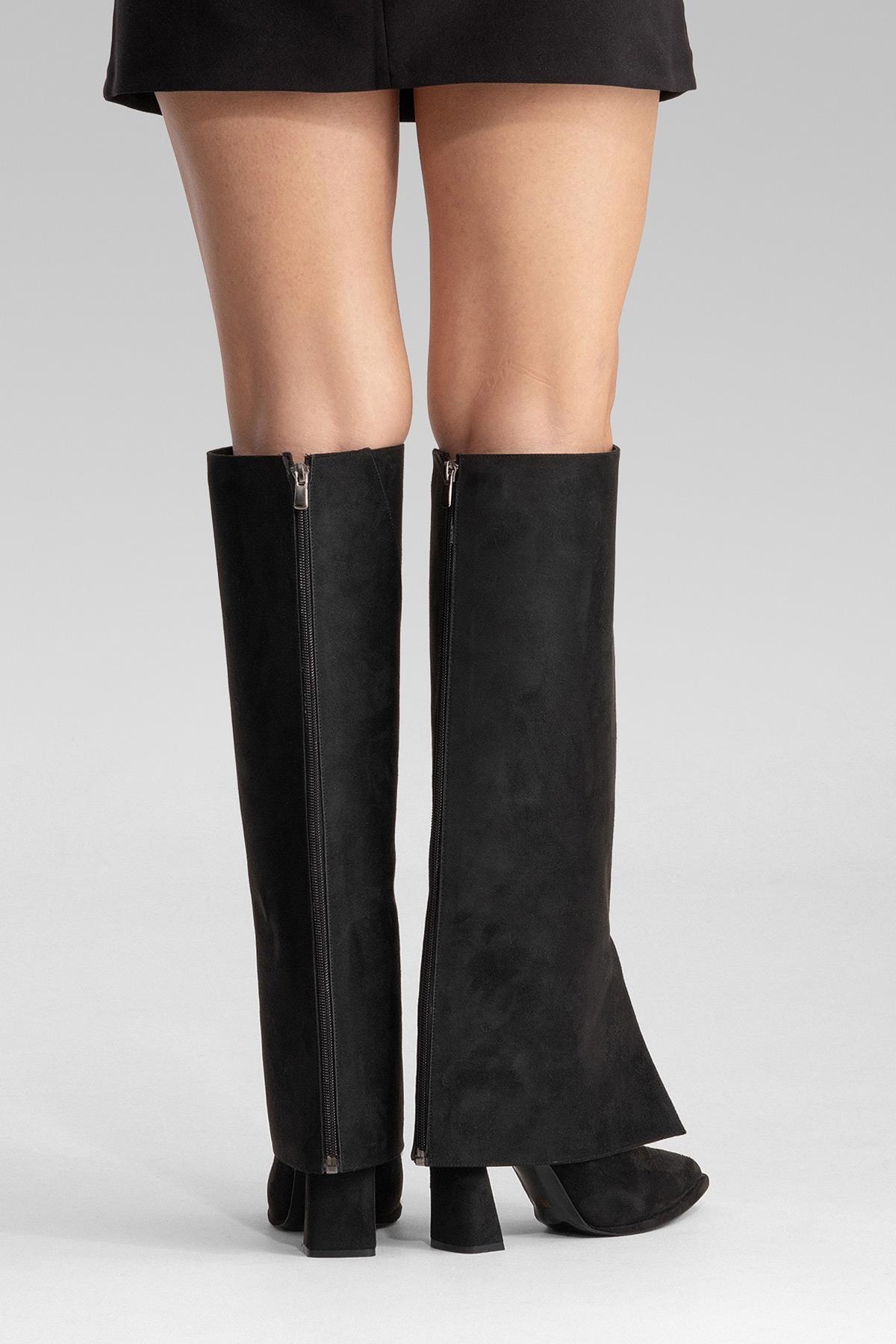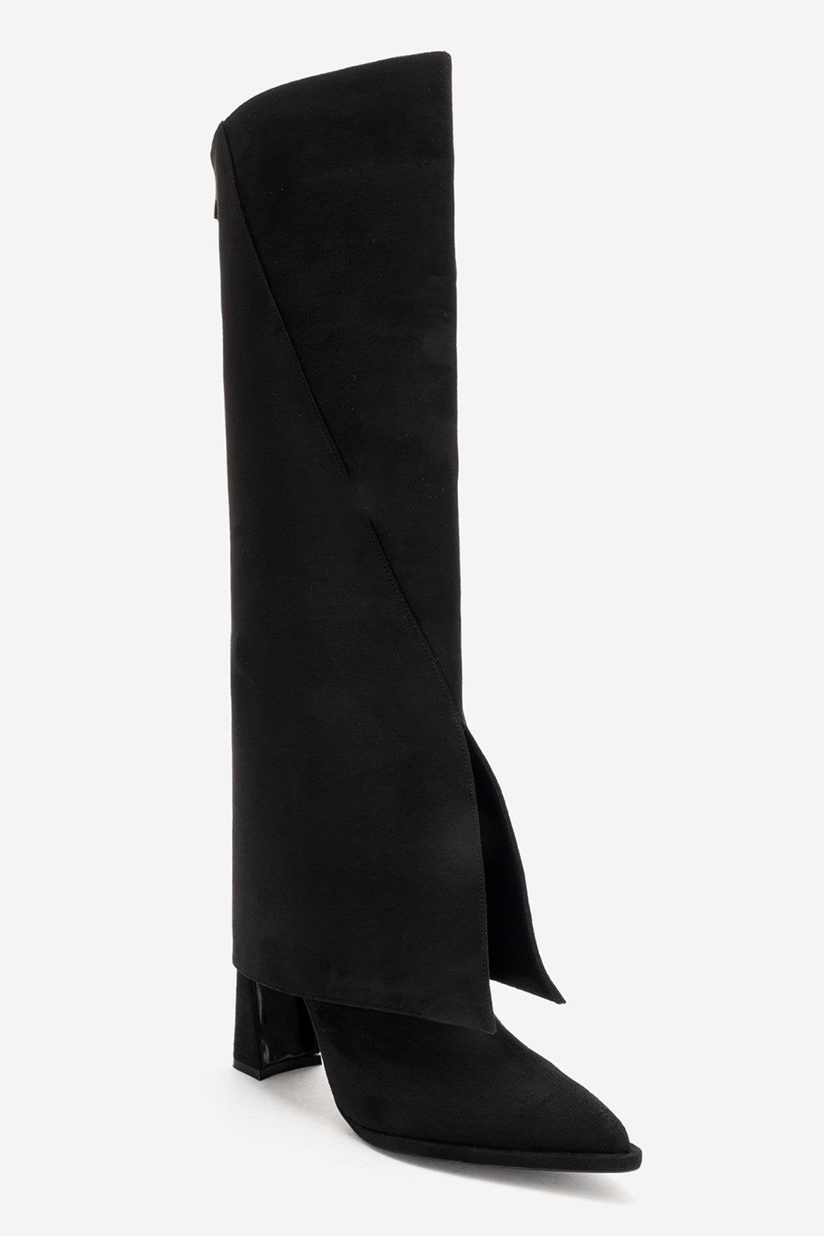 A sculpted block-heel boot that elongates the leg with a sleek paneled silhouette | 3.9" (10 cm) heel | 15.6" (40 cm) shaft | 10.9" (28 cm) ankle circumference | 15.6" (40 cm) calf circumference | 4.9" (12.5 cm) forefoot width | Synthetic suede upper / Warm lining / Neolite sole | Handmade in Turkey, true to size