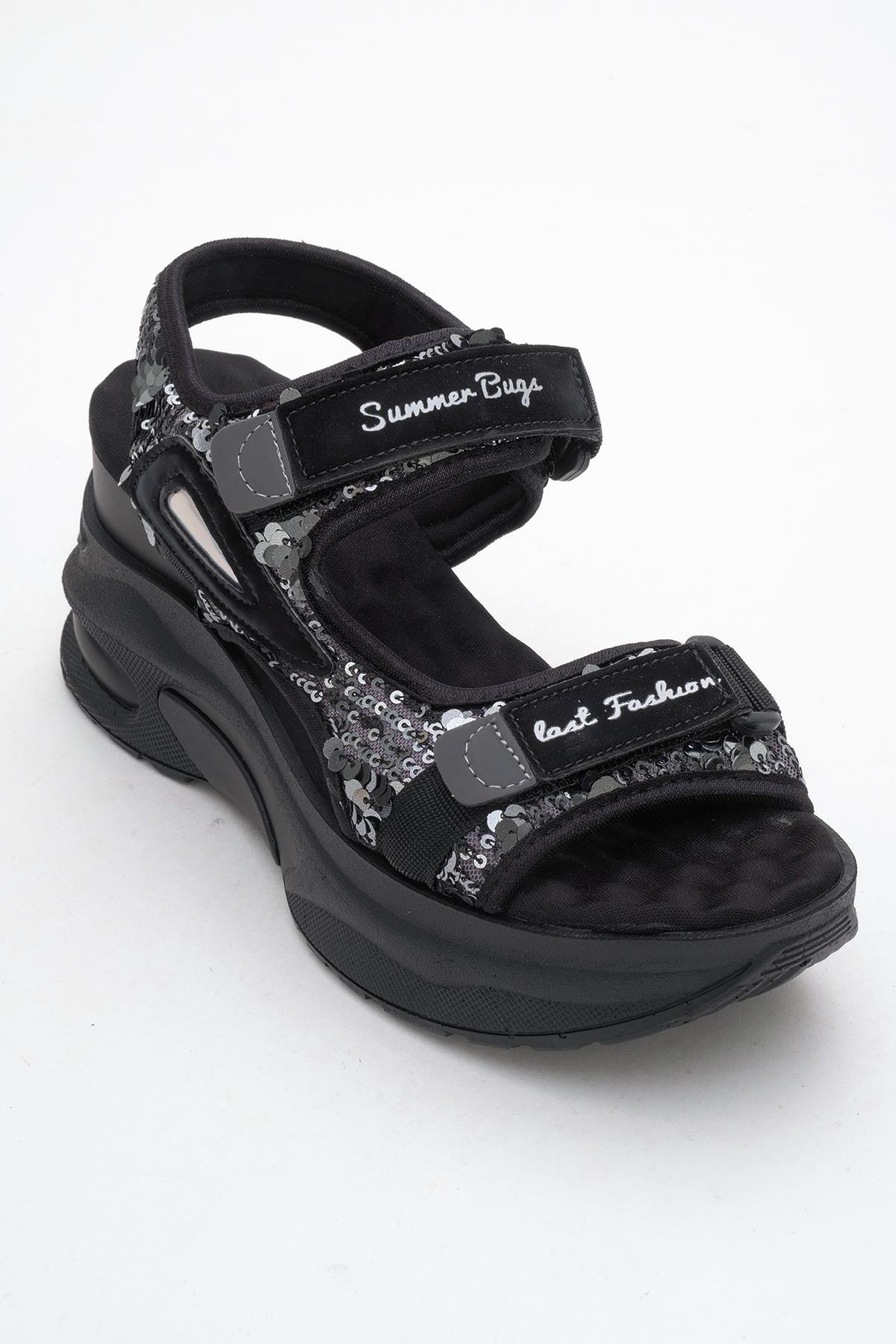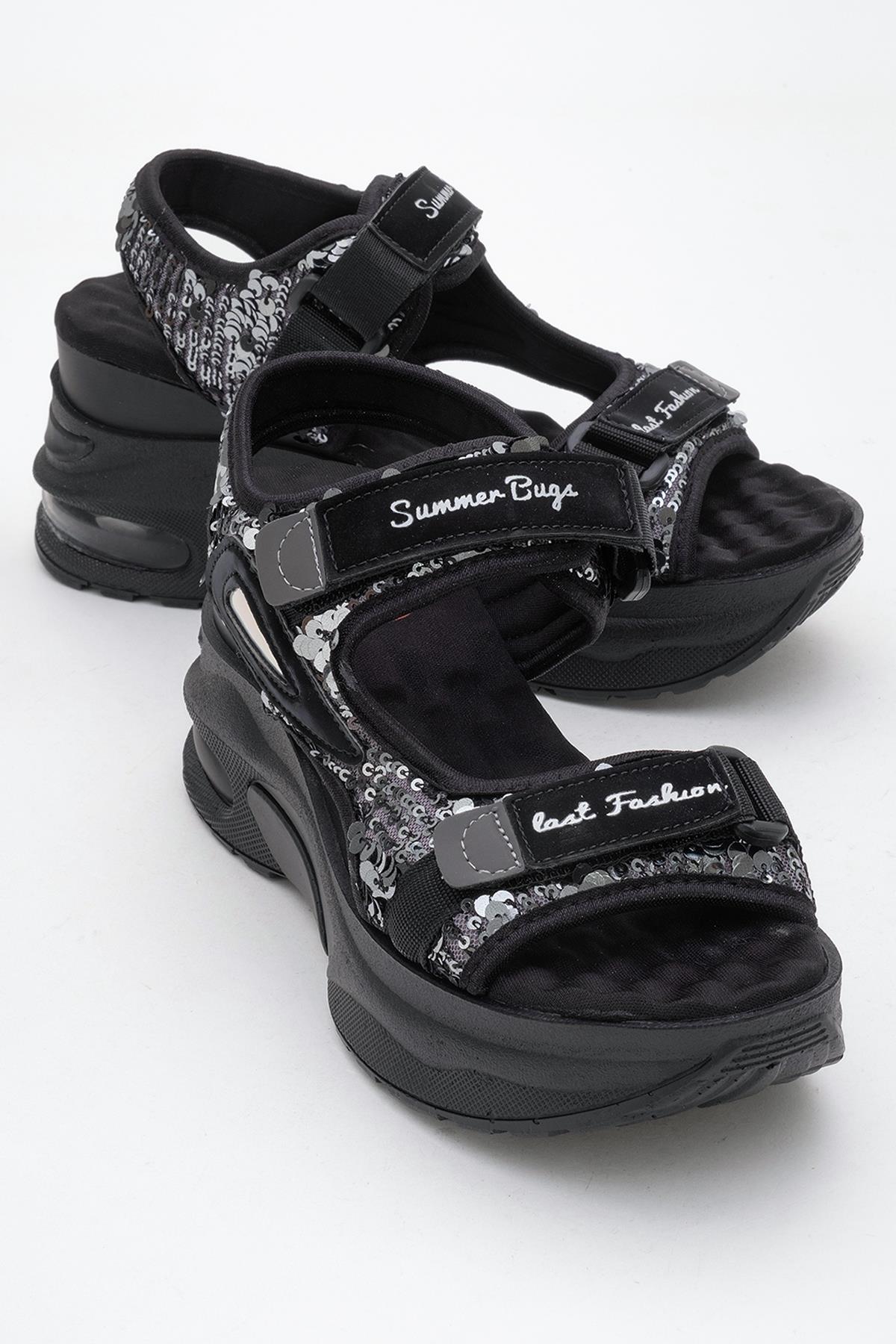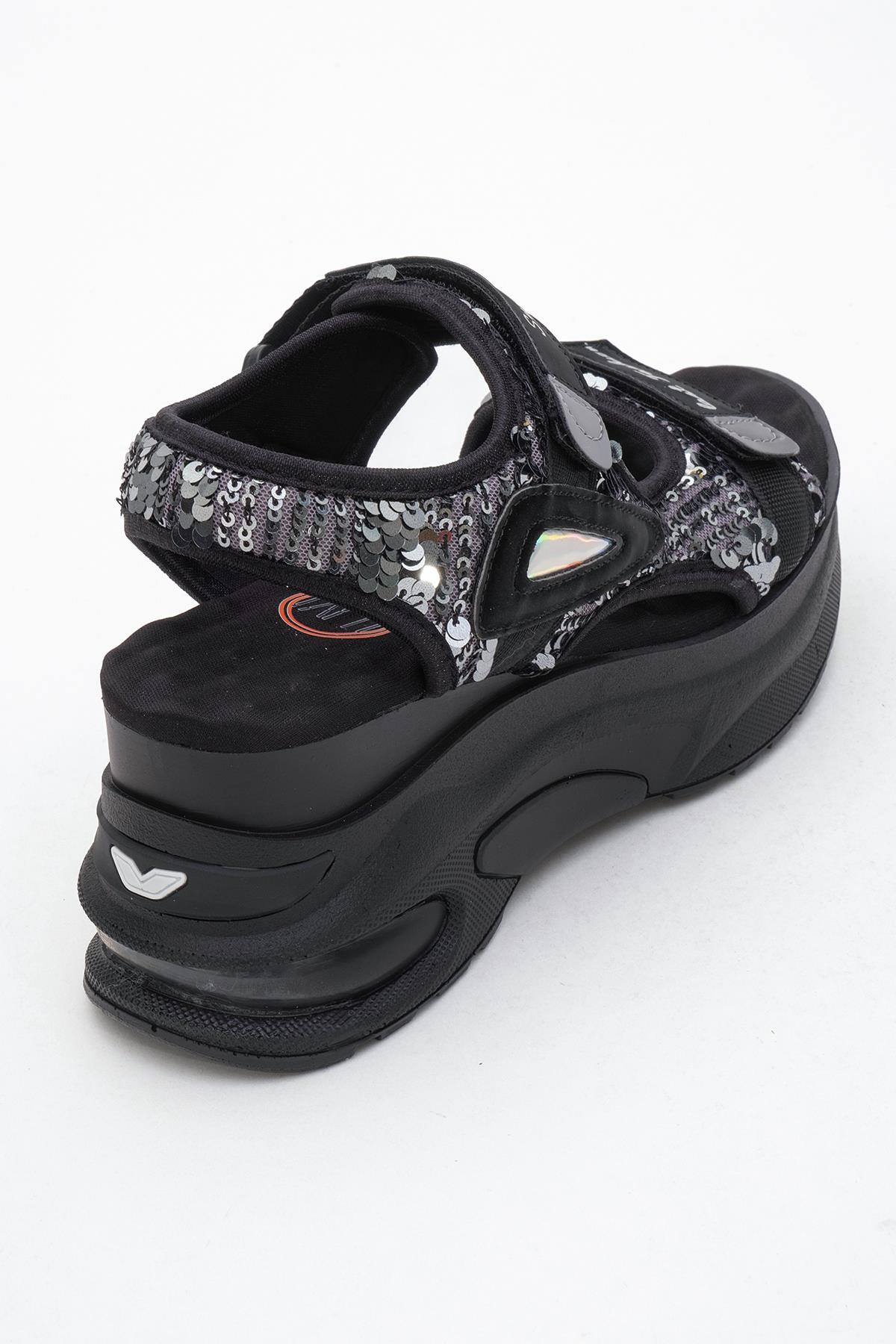 A modern sport sandal sparkling with sequined straps for statement-making comfort | 3.1" (8 cm) heel (1.4" (3.5 cm) front platform) | Synthetic leather upper / textile lining / polyurethane sole | Handmade in Turkey, true to size