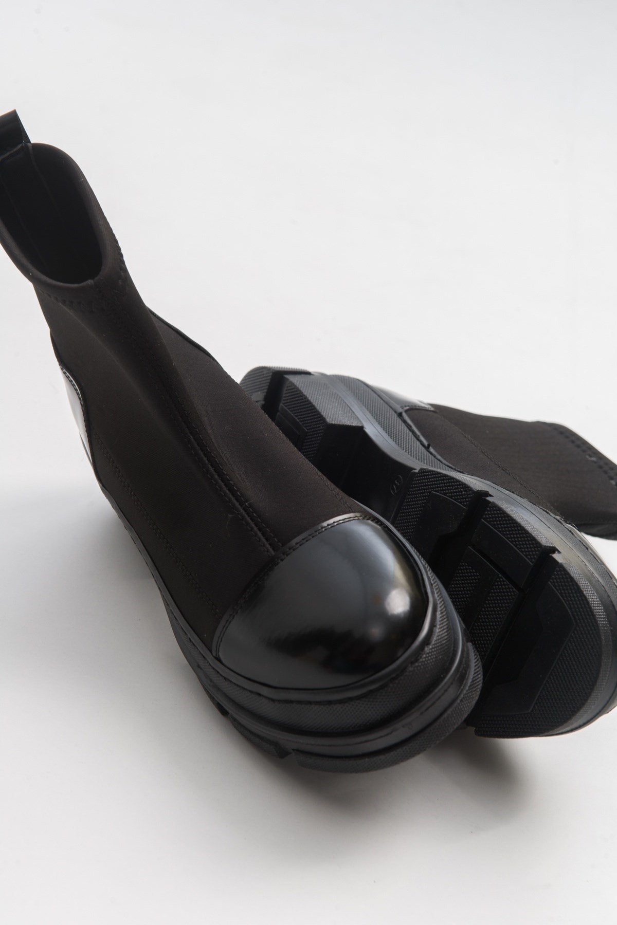 A contemporary scuba boot crafted for daily wear with structured lines and breathable textile inserts | 2.0" (5 cm) heel | 5.1" (13 cm) shaft | 9.4" (24 cm) forefoot width | Synthetic leather and textile upper / textile lining / thermo sole | Handmade in Turkey, true to size