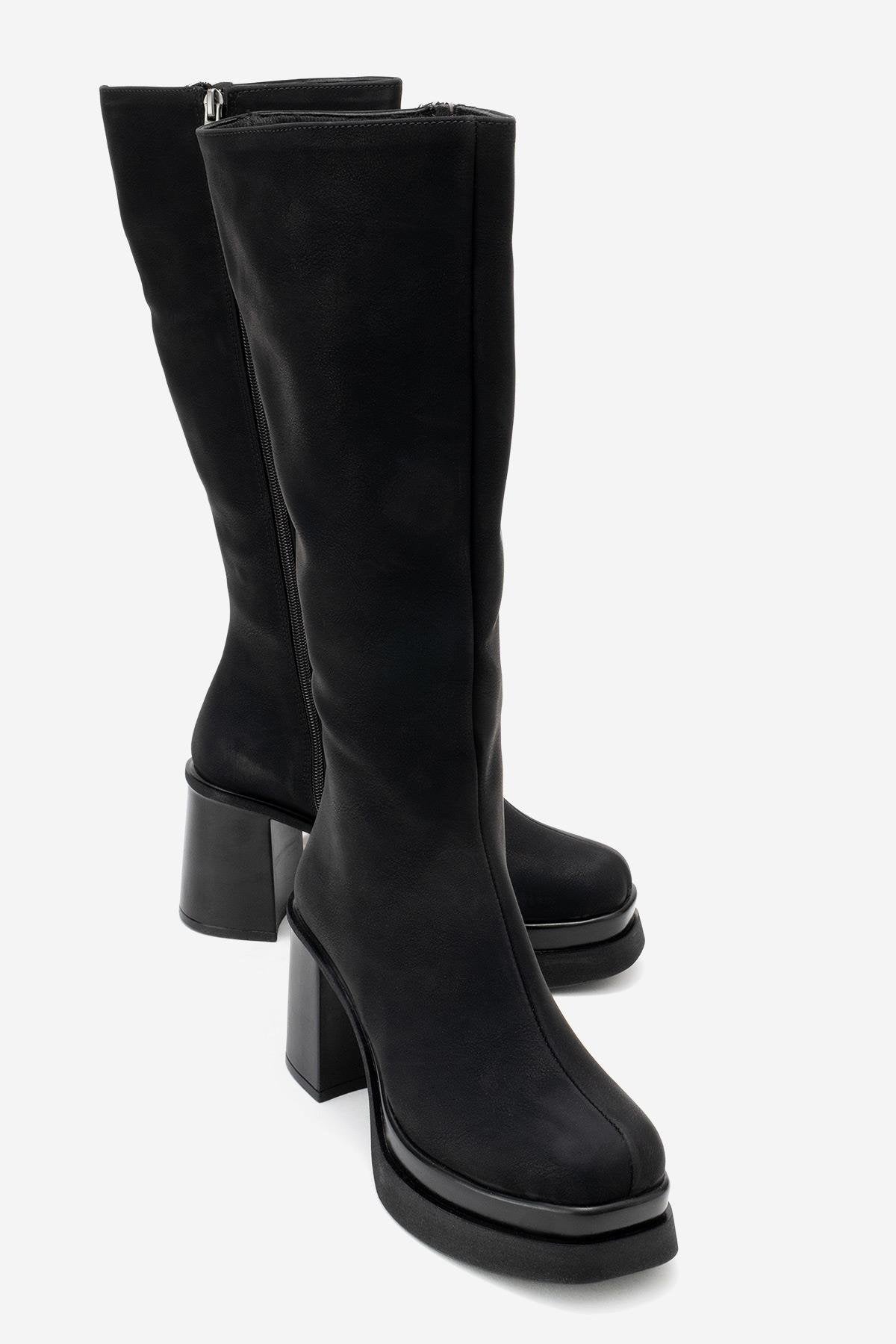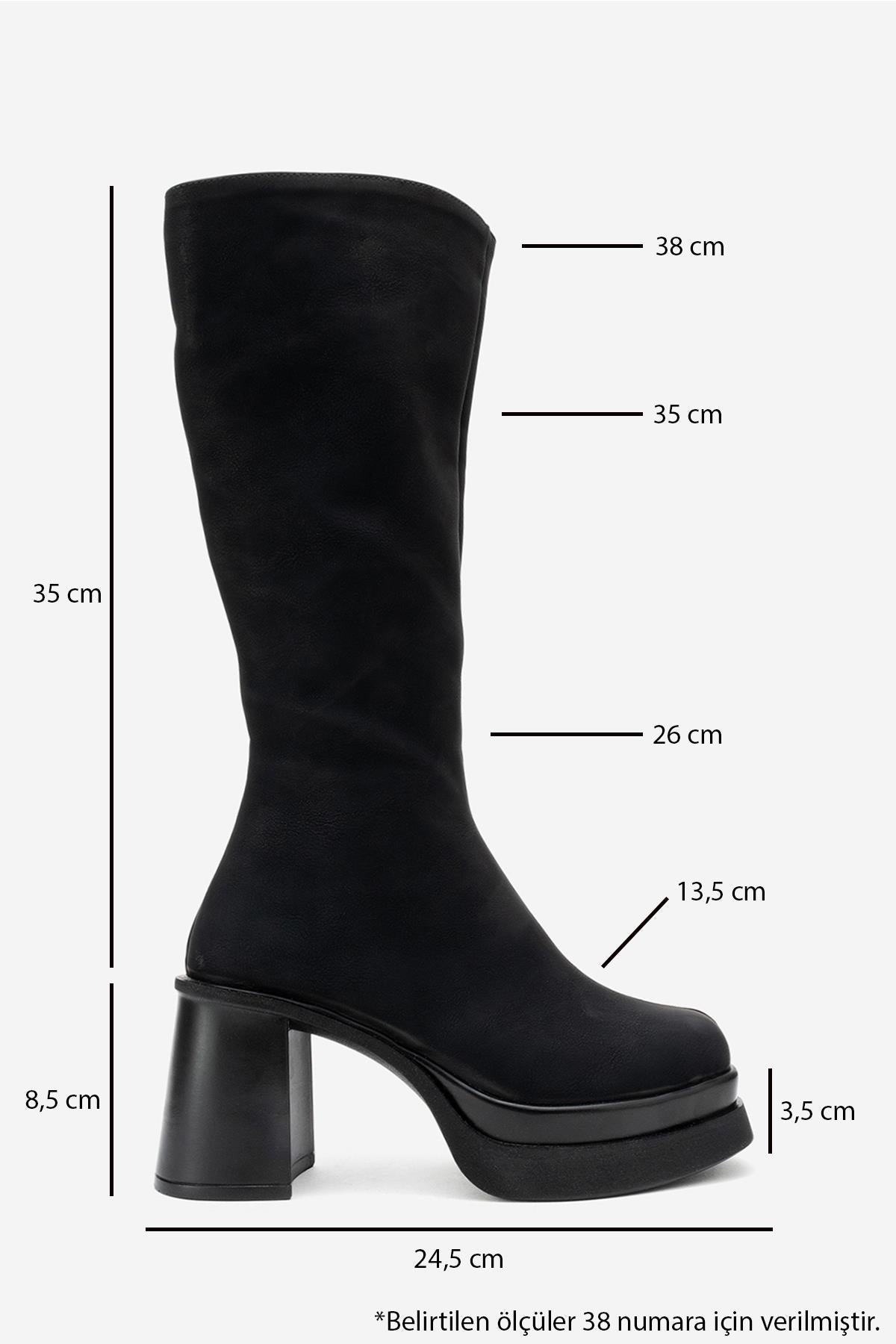 A bold platform boot with a clean, modern silhouette that brings height and attitude without compromising comfort | 3.3" (8.5 cm) heel | 13.7" (35 cm) shaft | 10.1" (26 cm) ankle circumference | 13.7" (35 cm) calf circumference | 5.3" (13.5 cm) forefoot width | Synthetic leather upper / synthetic leather and warm lining / polyurethane sole | Handmade in Turkey, true to size