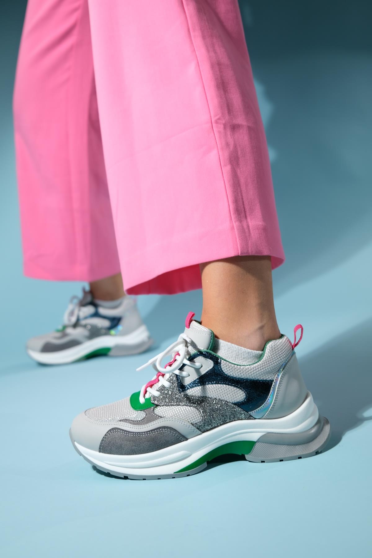 A statement sneaker with a bold sole and glitter accents for elevated casual looks | 1.6" (4.0 cm) heel | Synthetic leather and textile upper / textile lining / thermo sole | Handmade in Turkey, true to size