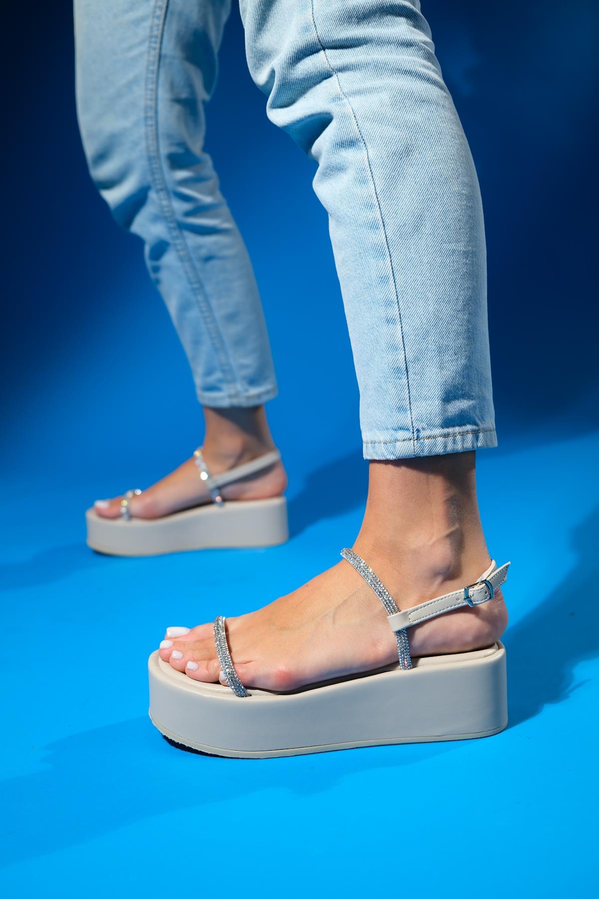 A refined stone-embellished thick-sole sandal that brings subtle glamour to warm-weather wardrobes | 2.1" (5.5 cm) heel | Synthetic leather upper / synthetic leather lining / polyurethane sole | Handmade in Turkey, true to size