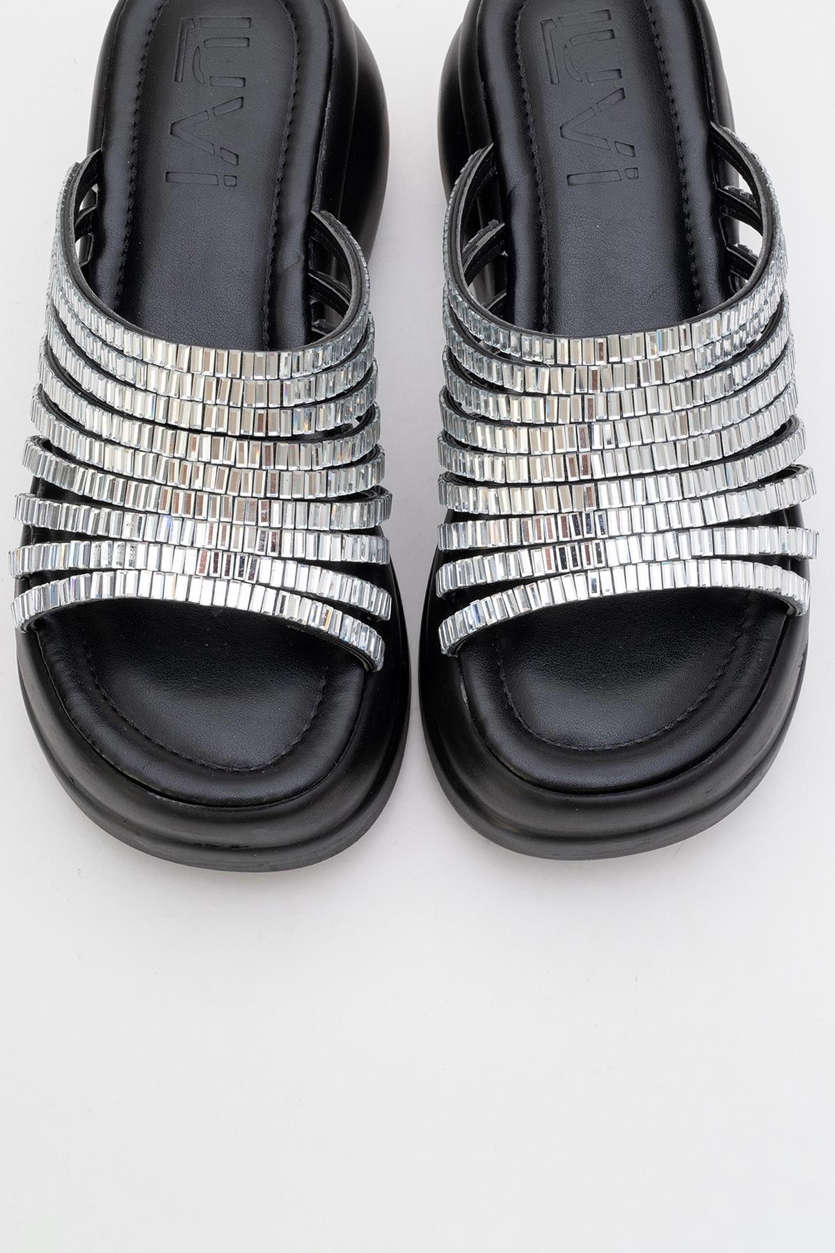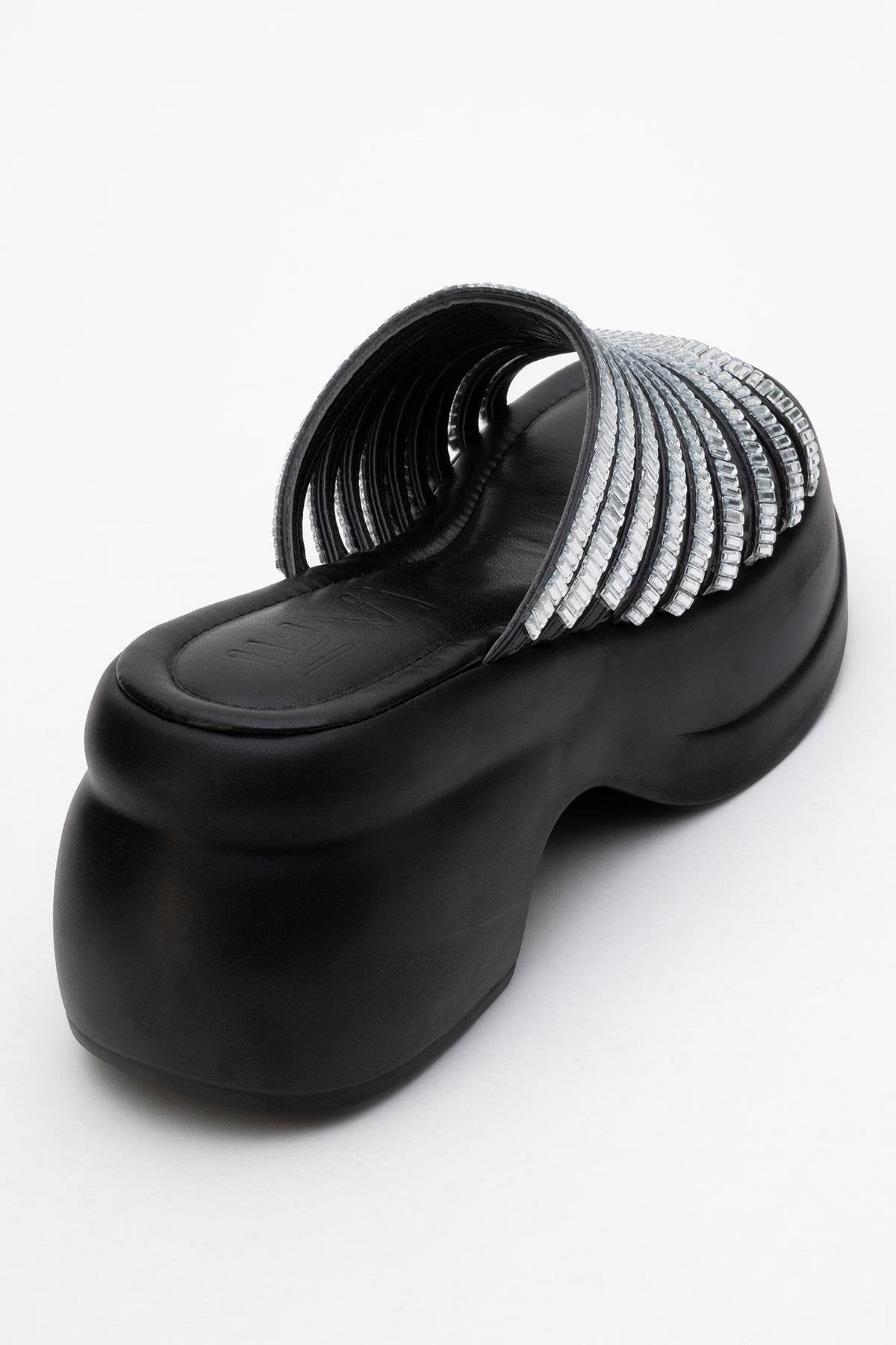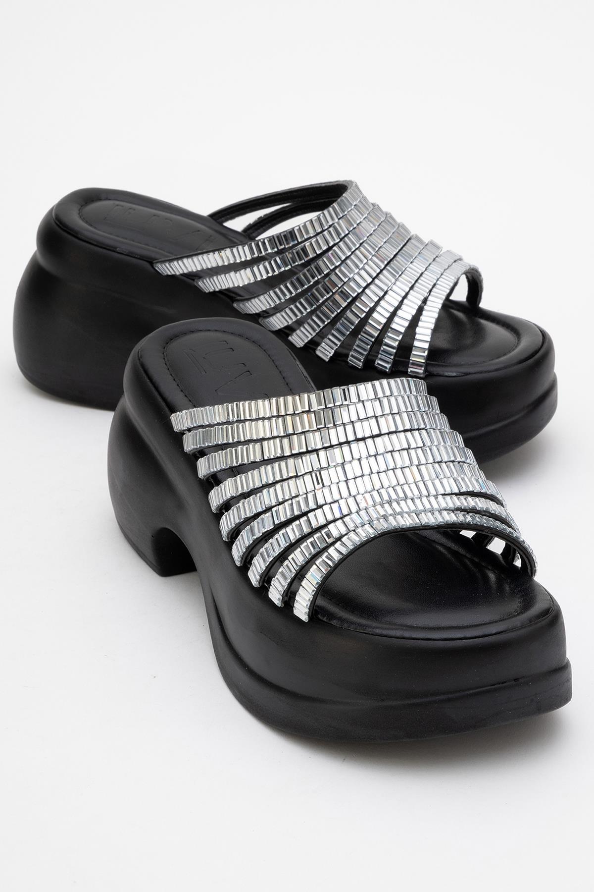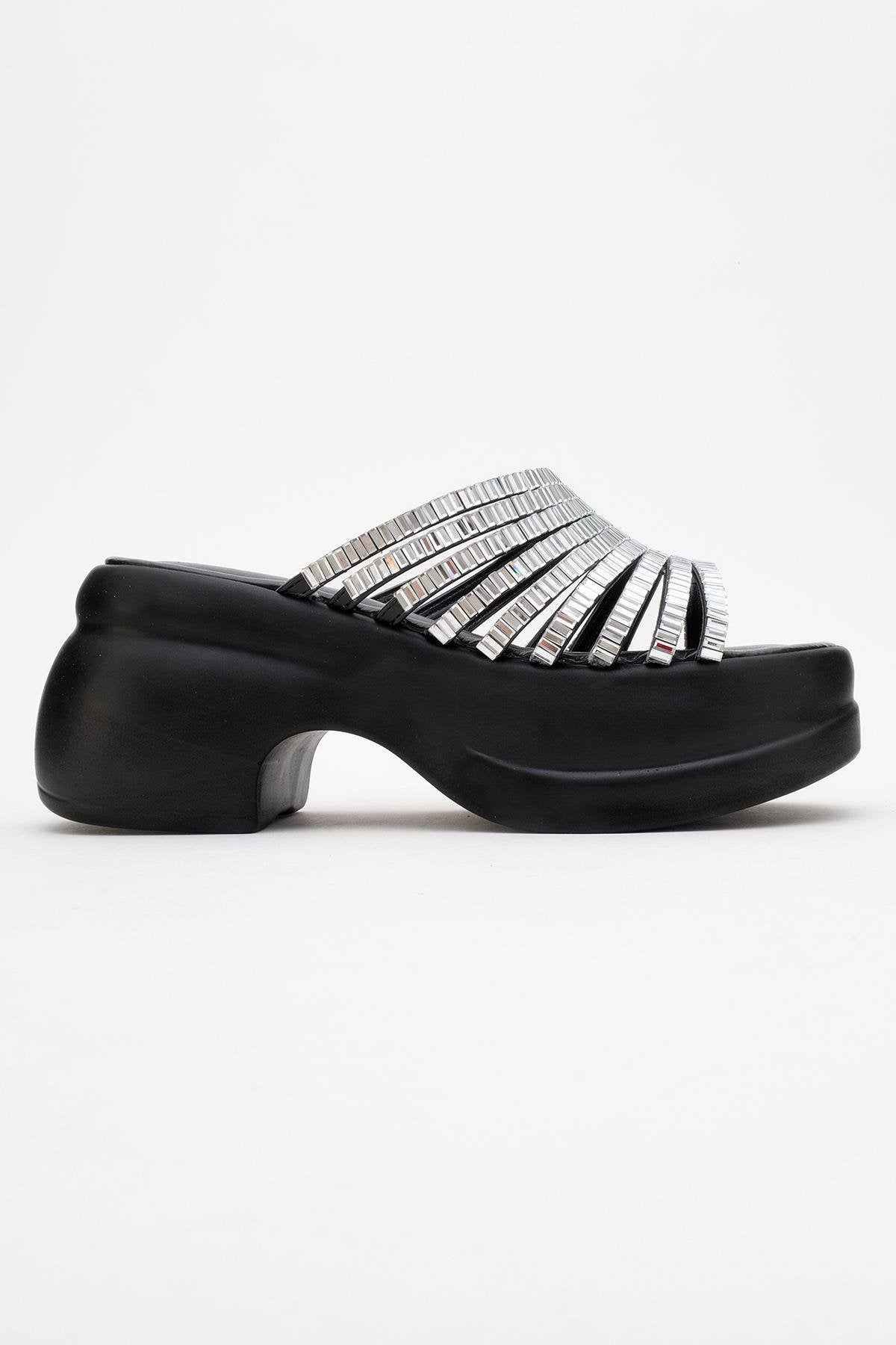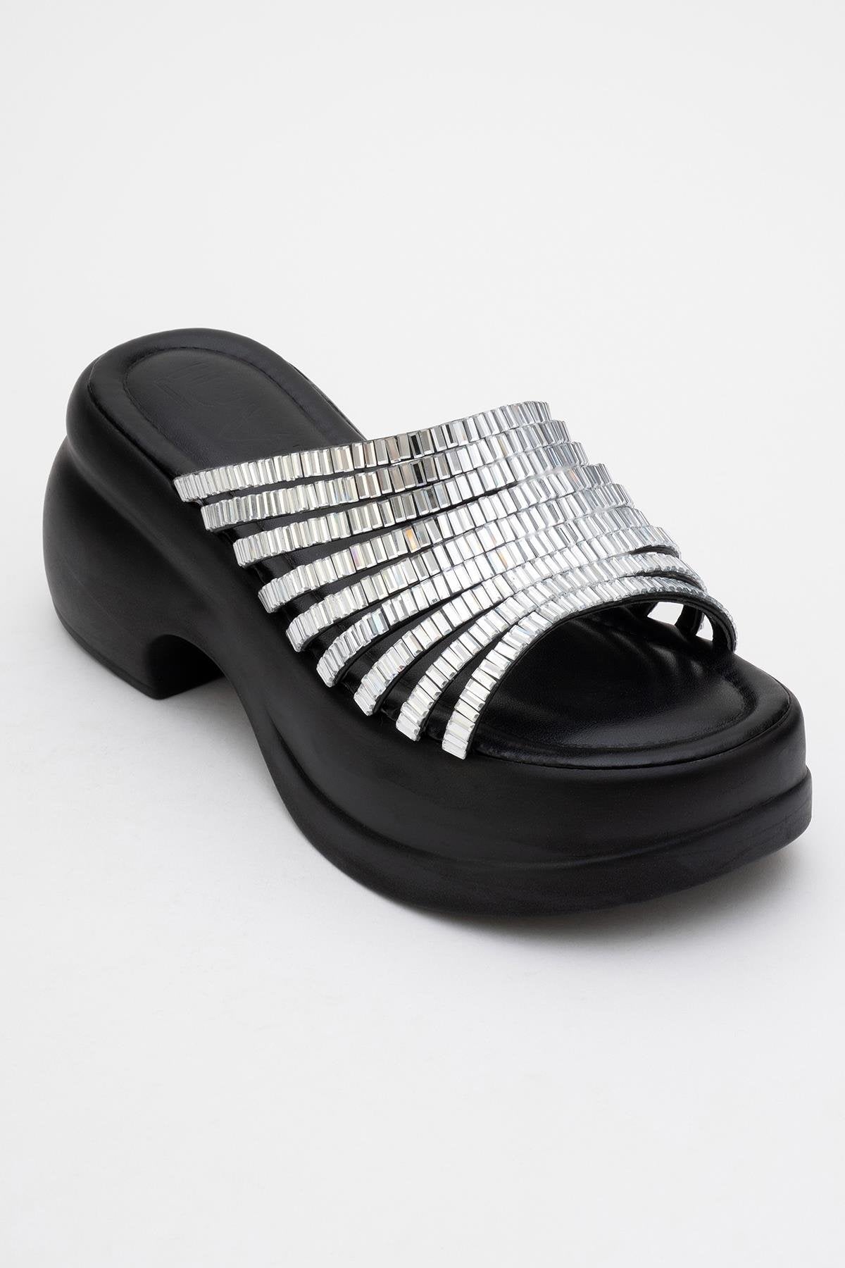 A bold platform sandal that fuses comfort with eye-catching metallic accents for a confident, modern finish