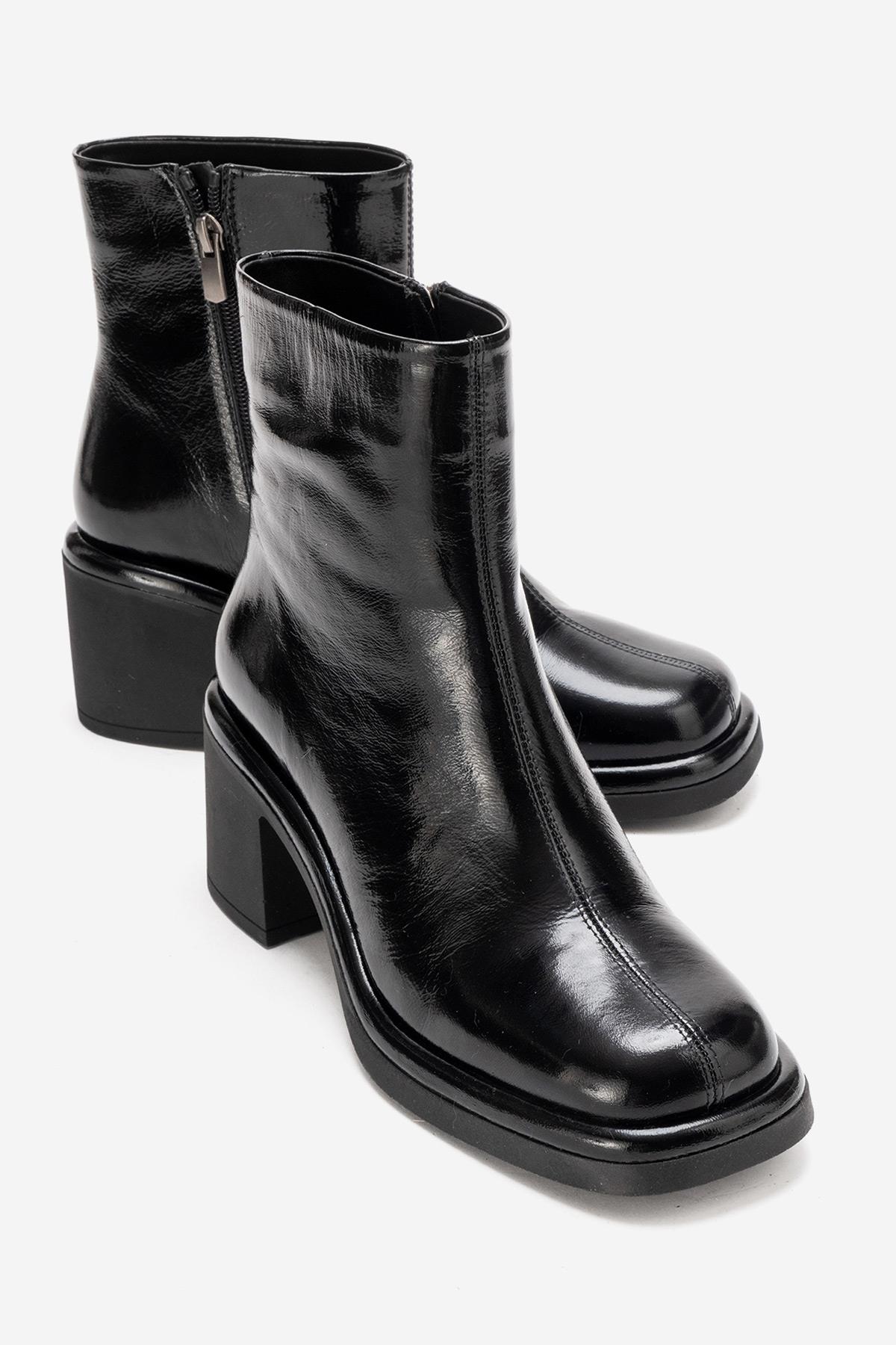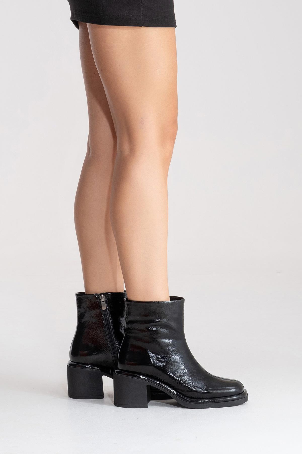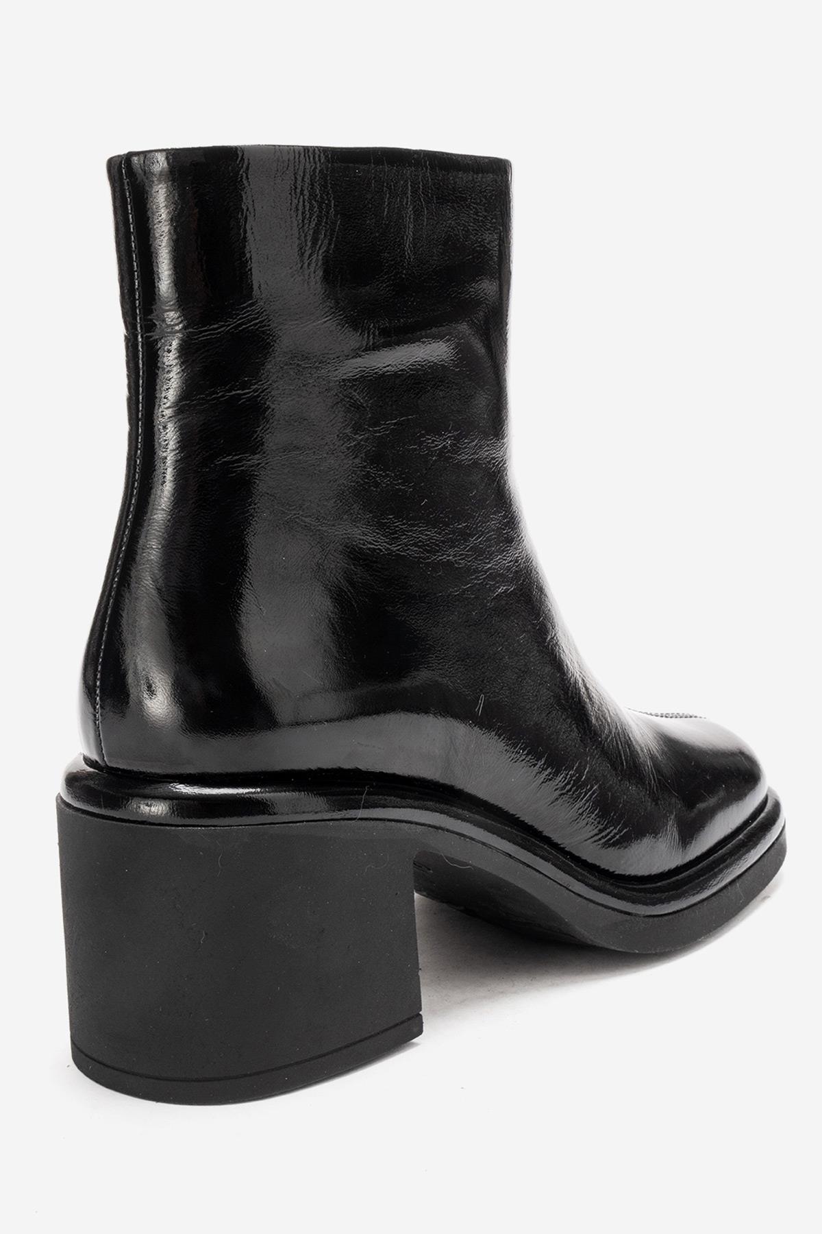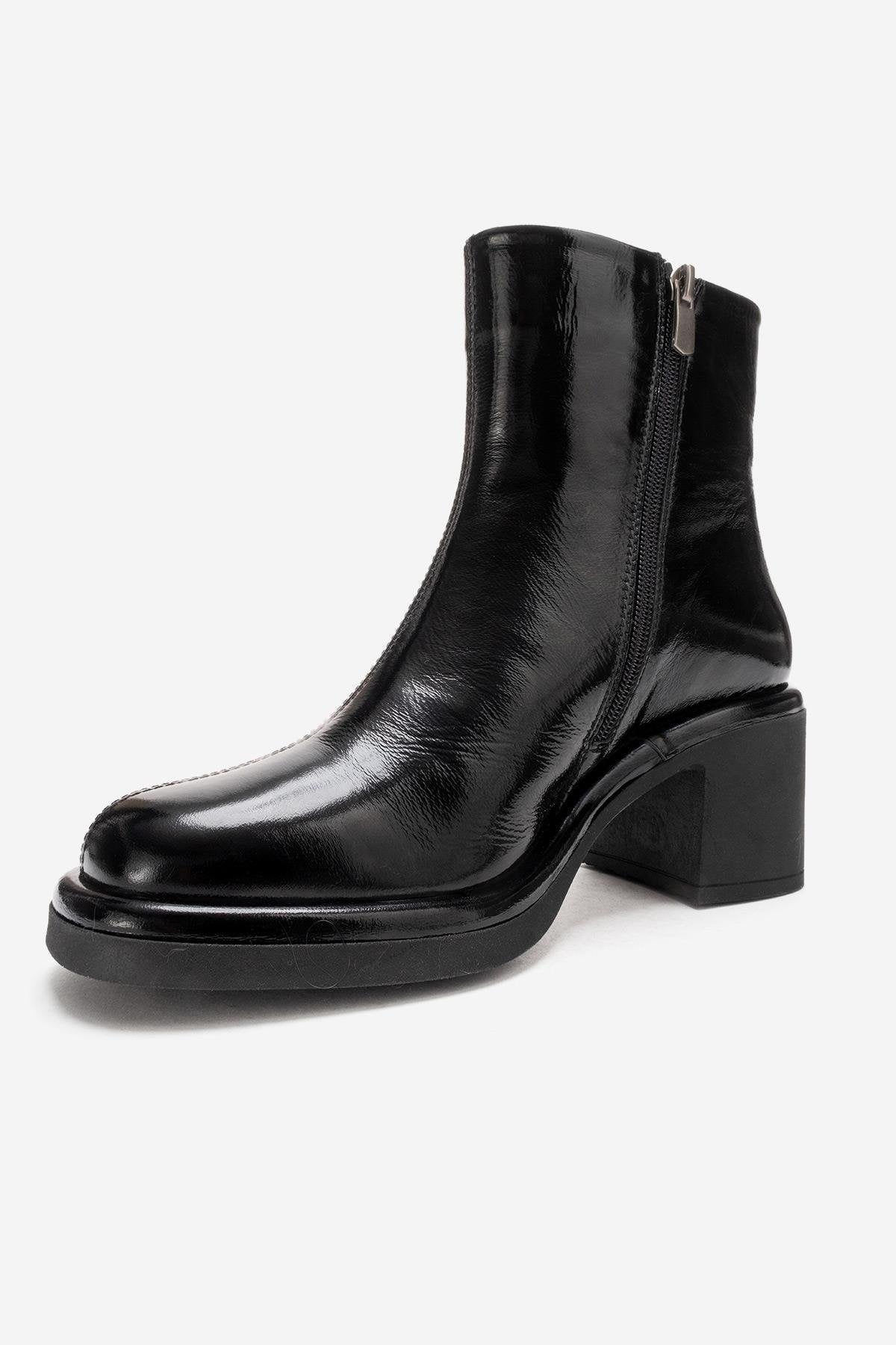 A sophisticated patent-finish boot that reinterprets classic elegance with a modern attitude | 2.8" (7 cm) heel with 0.8" (2 cm) front platform | 5.3" (13.5 cm) shaft | 11.0" (28 cm) ankle circumference | 5.1" (13 cm) forefoot width | Genuine Leather upper / Warm lining / Rubber sole | Handmade in Turkey, true to size