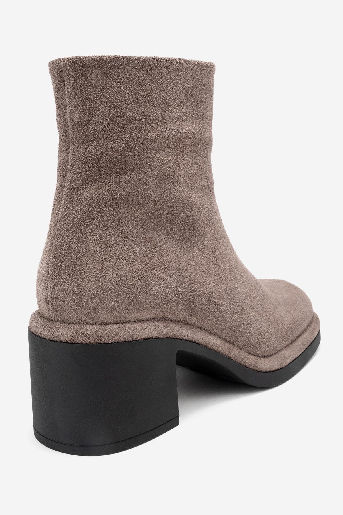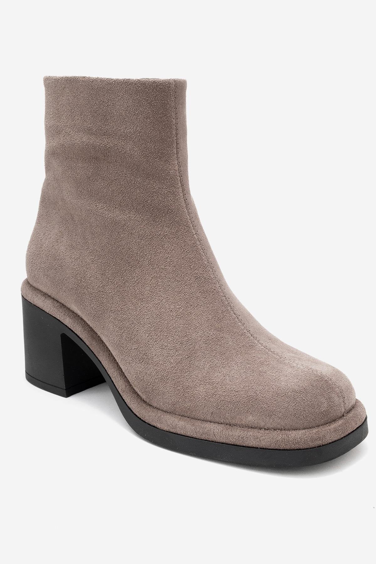 A refined bootie that blends soft suede surfaces with a clean, modern silhouette