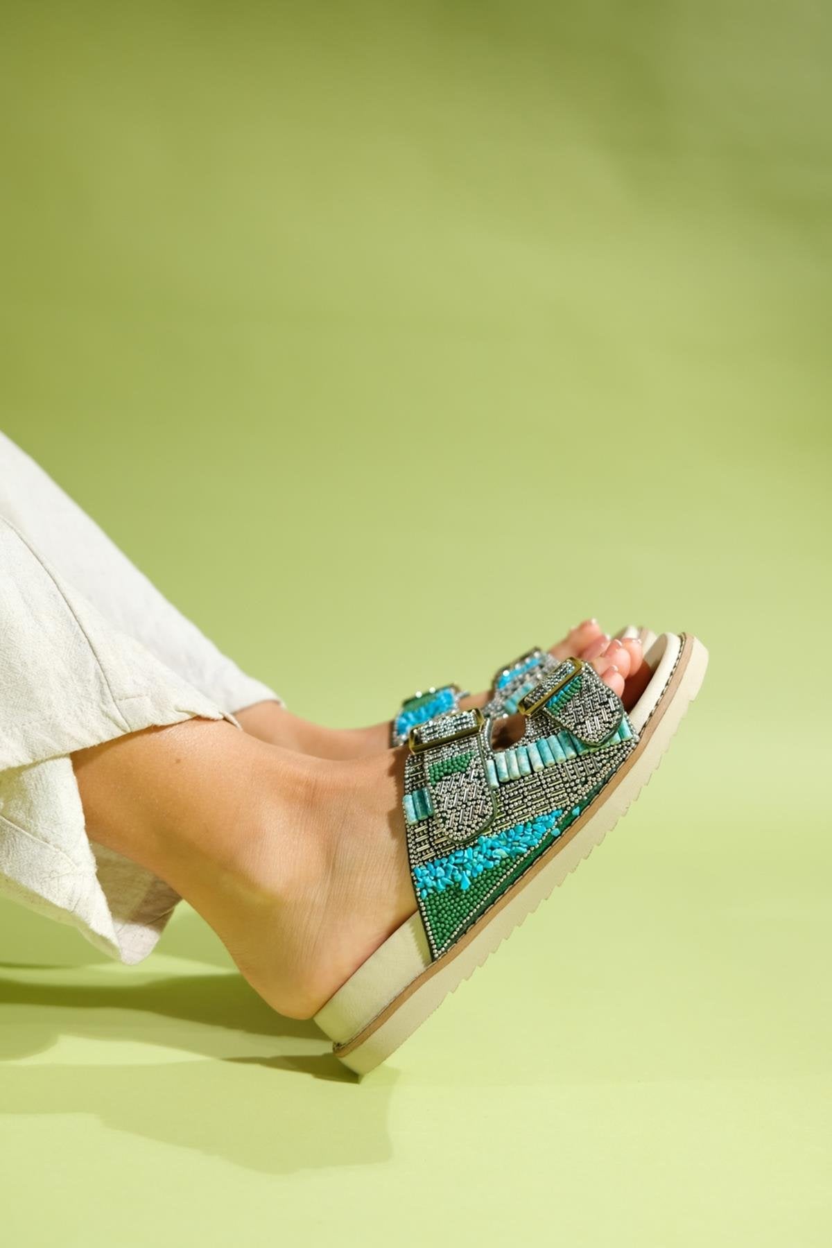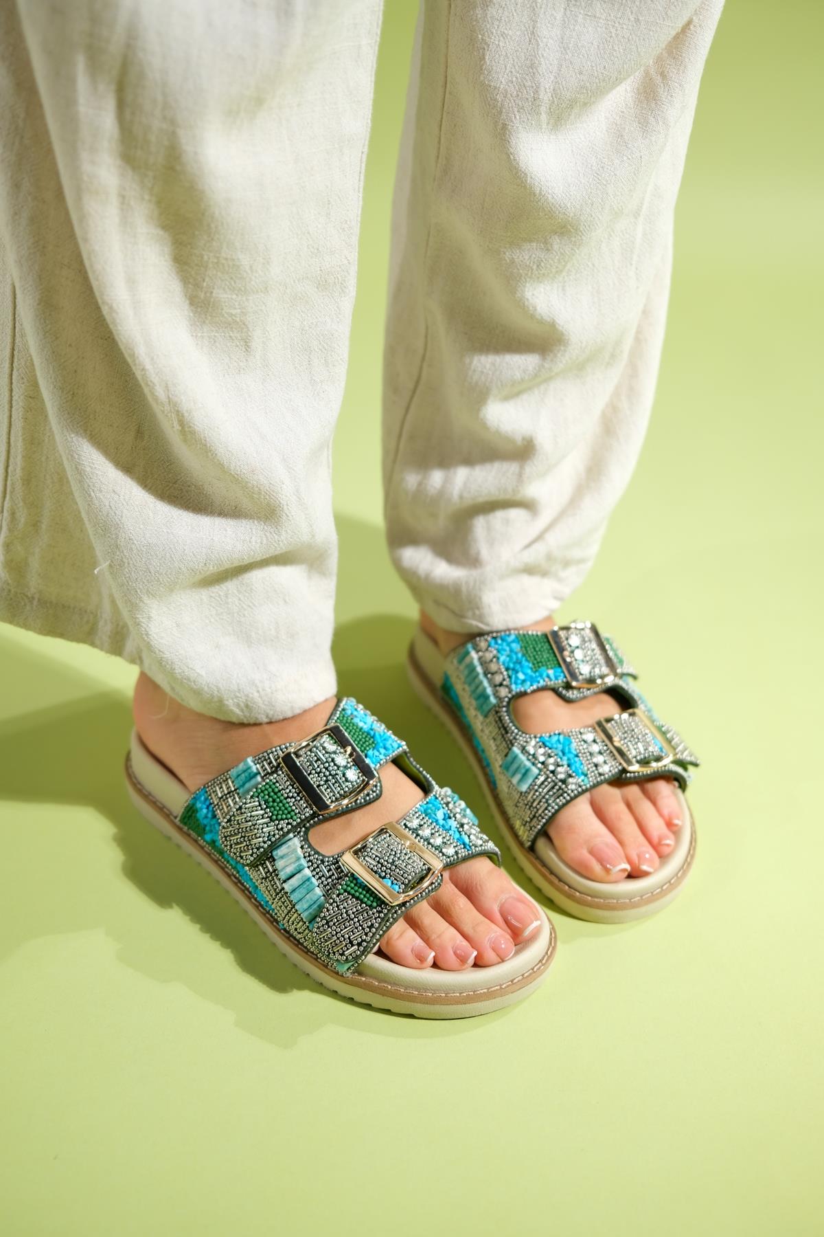 Lanso - Green Jeweled Double Strap Slide (Women)