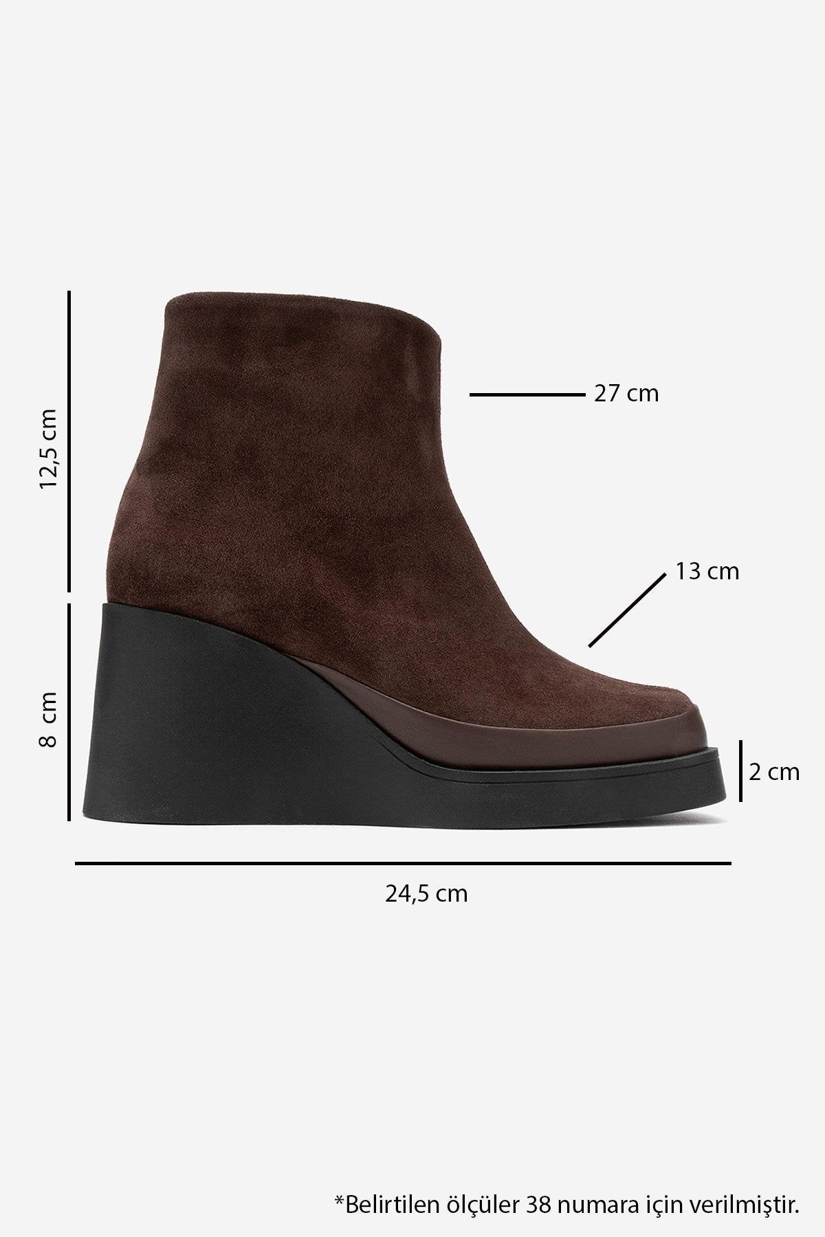A refined ankle boot that fuses soft suede texture with a sculpted wedge platform for elevated everyday elegance | 3.1" (8 cm) heel | 4.9" (12.5 cm) shaft | 10.5" (27 cm) ankle circumference | 5.1" (13 cm) forefoot width | Genuine leather upper (suede) / warm lining / rubber sole | Handmade in Turkey, true to size