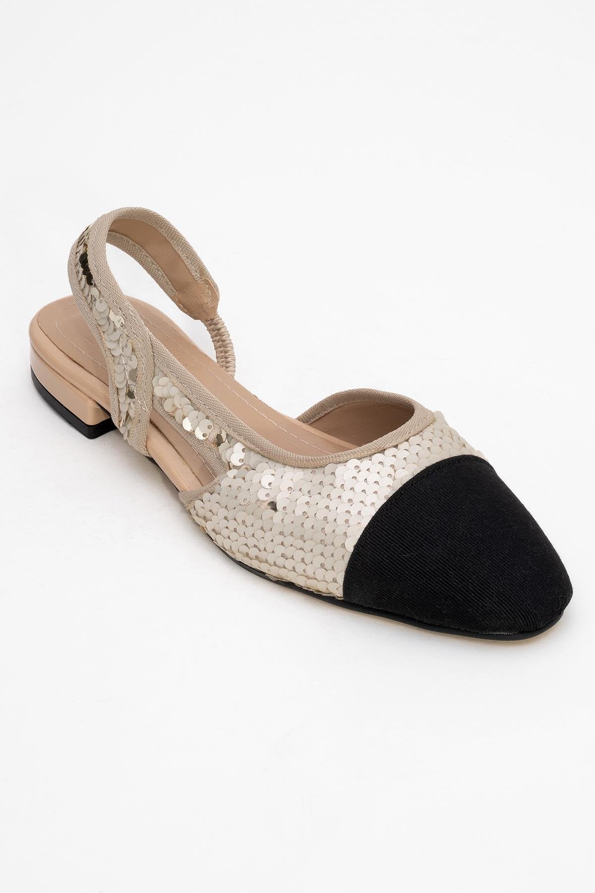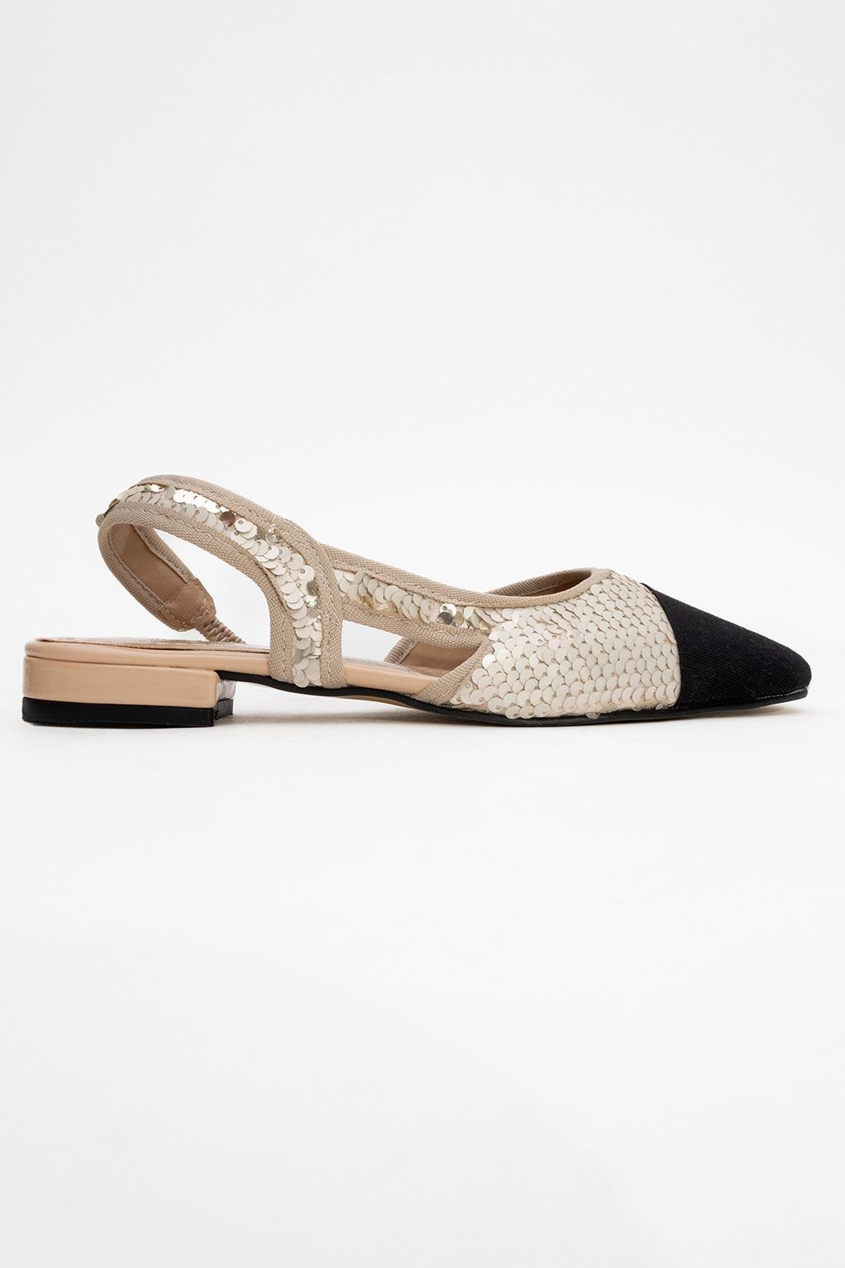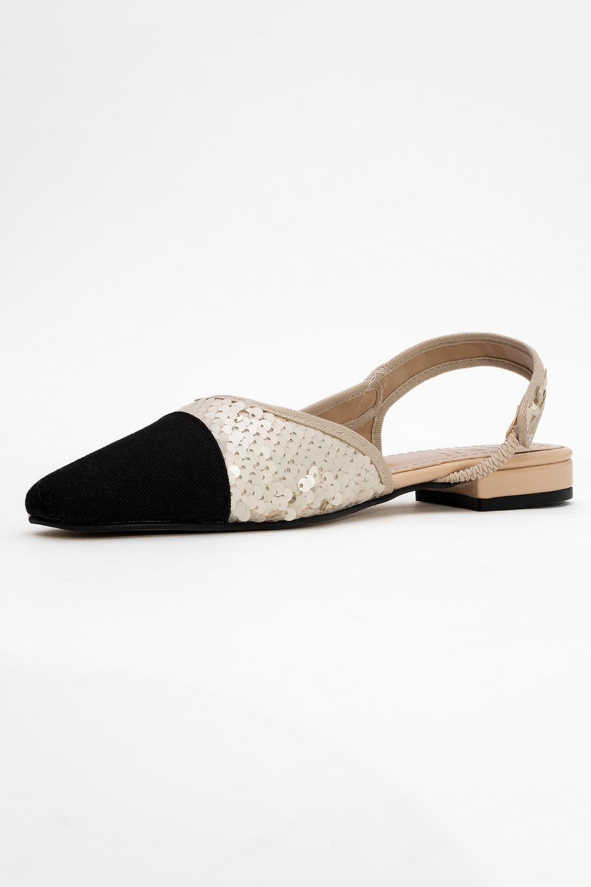 A chic backless ballerina that elevates casual looks with refined shimmer