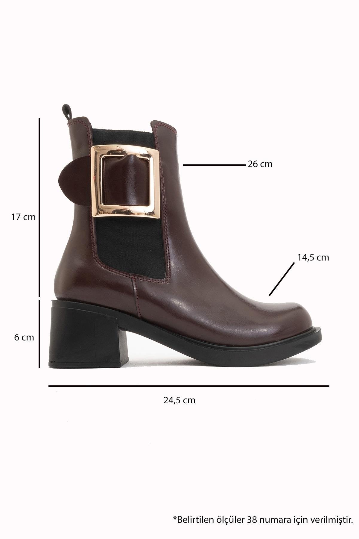 A refined block-heel boot featuring buckle and elastic details with a convenient side zip for effortless wear | 2.3" (6 cm) heel | 6.6" (17 cm) shaft | 10.1" (26 cm) ankle circumference | 5.7" (14.5 cm) forefoot width | Synthetic leather upper / warm lining / polyurethane sole | Handmade in Turkey, true to size