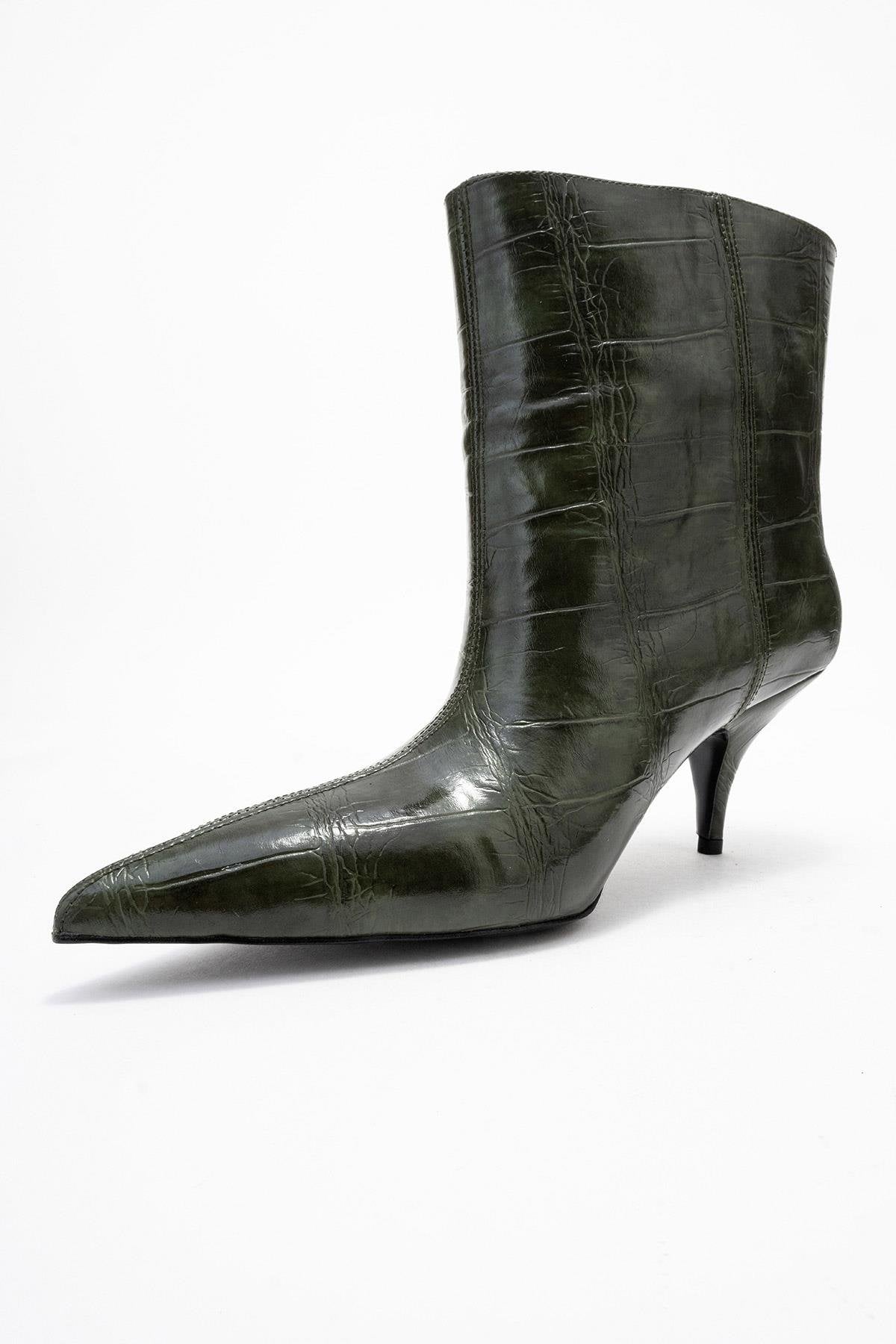 A modern kitten-heel boot with refined crocodile-embossed texture and a sleek pointed toe | 2.7" (7 cm) heel | 5.3" (13.5 cm) shaft | 12.9" (33 cm) ankle circumference | 4.5" (11.5 cm) forefoot width | Synthetic leather upper / Synthetic leather & textile lining / Neolite sole | Handmade in Turkey, true to size