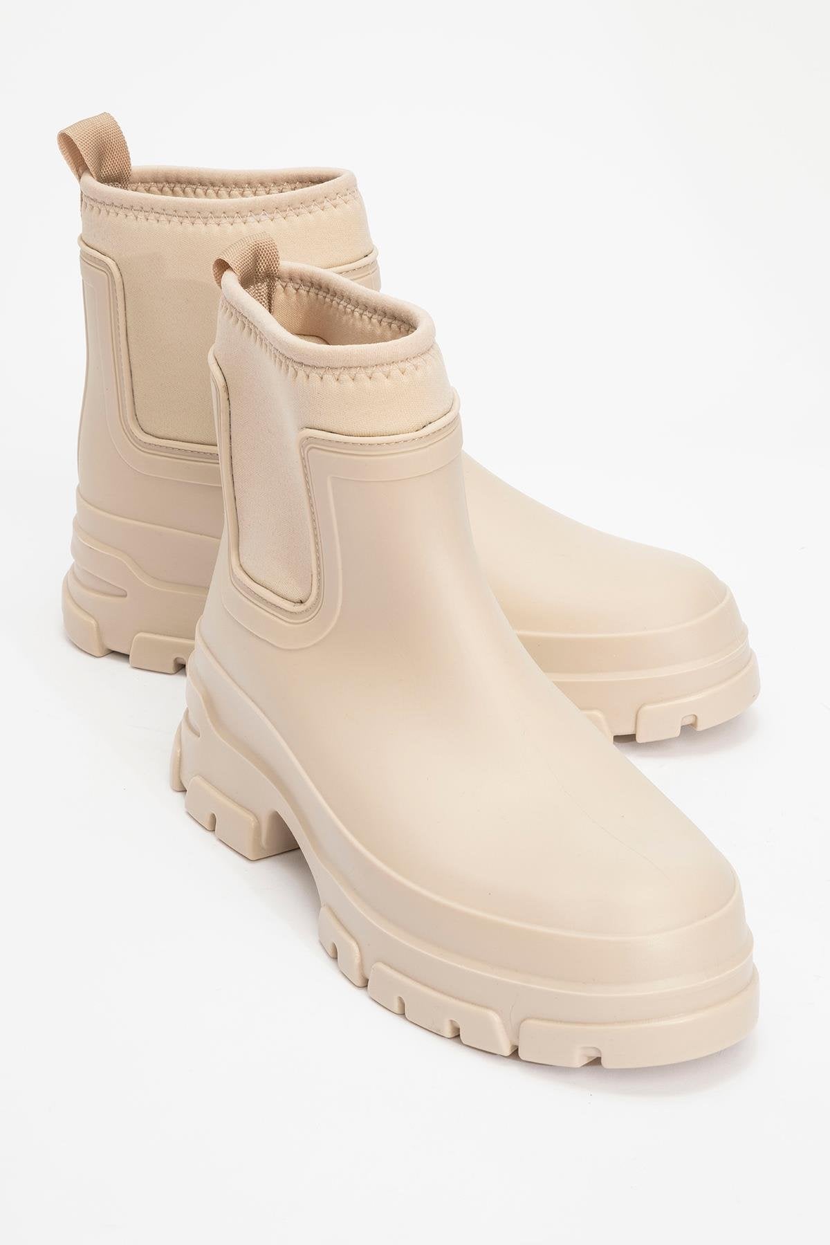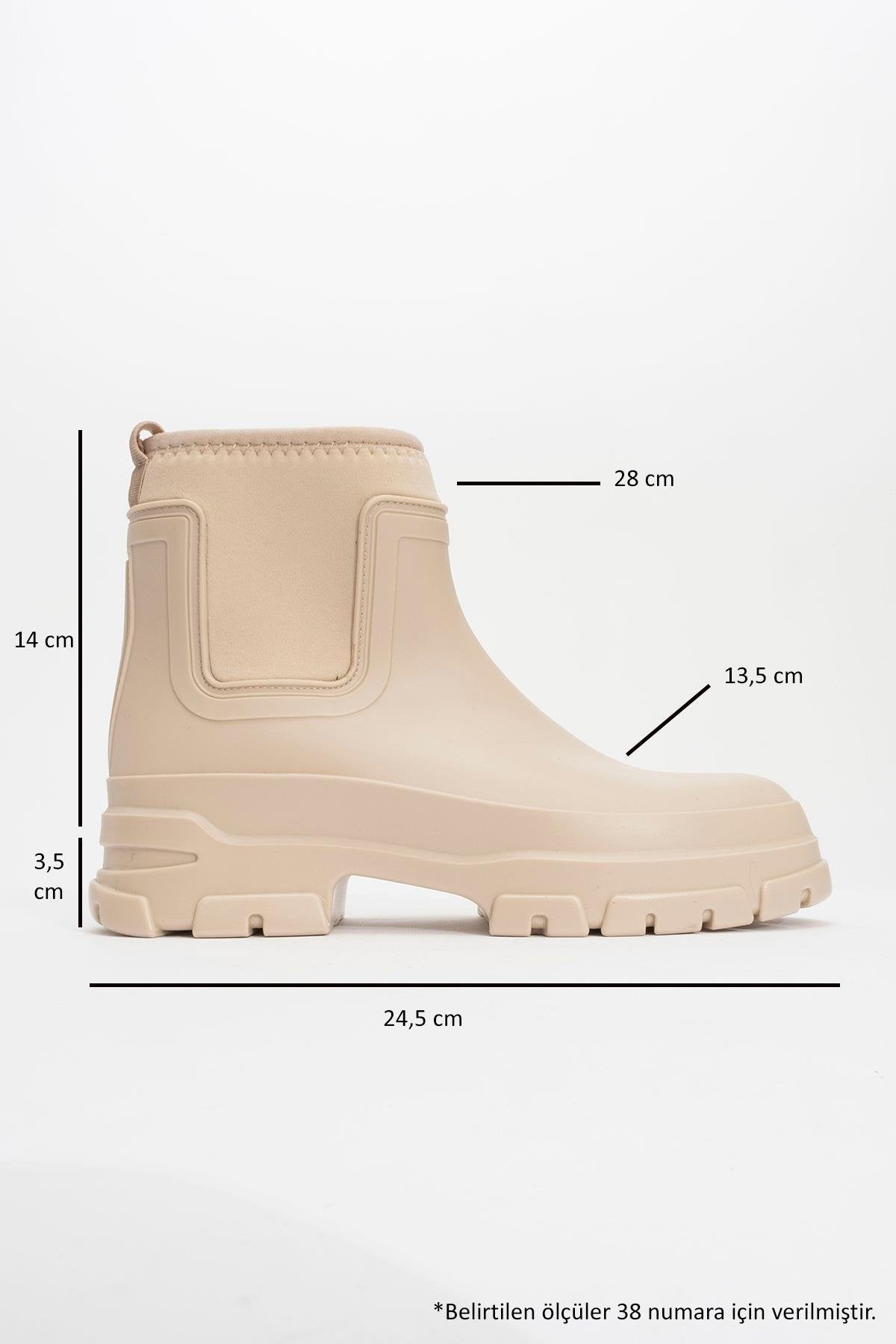 A fully waterproof rain boot crafted for modern city life with functional, stylish details | 1.4" (3.5 cm) heel | 5.5" (14 cm) shaft | 10.9" (28 cm) ankle circumference | 5.3" (13.5 cm) forefoot width | Plastic, scuba fabric upper / Scuba fabric lining / PVC sole | Handmade in Turkey, true to size