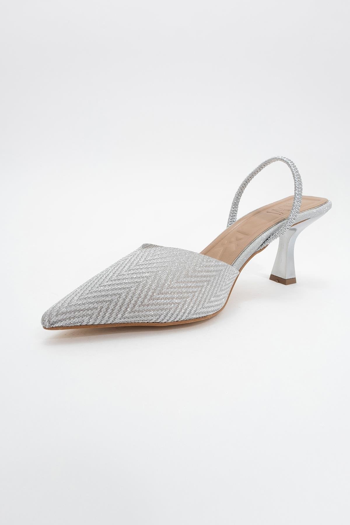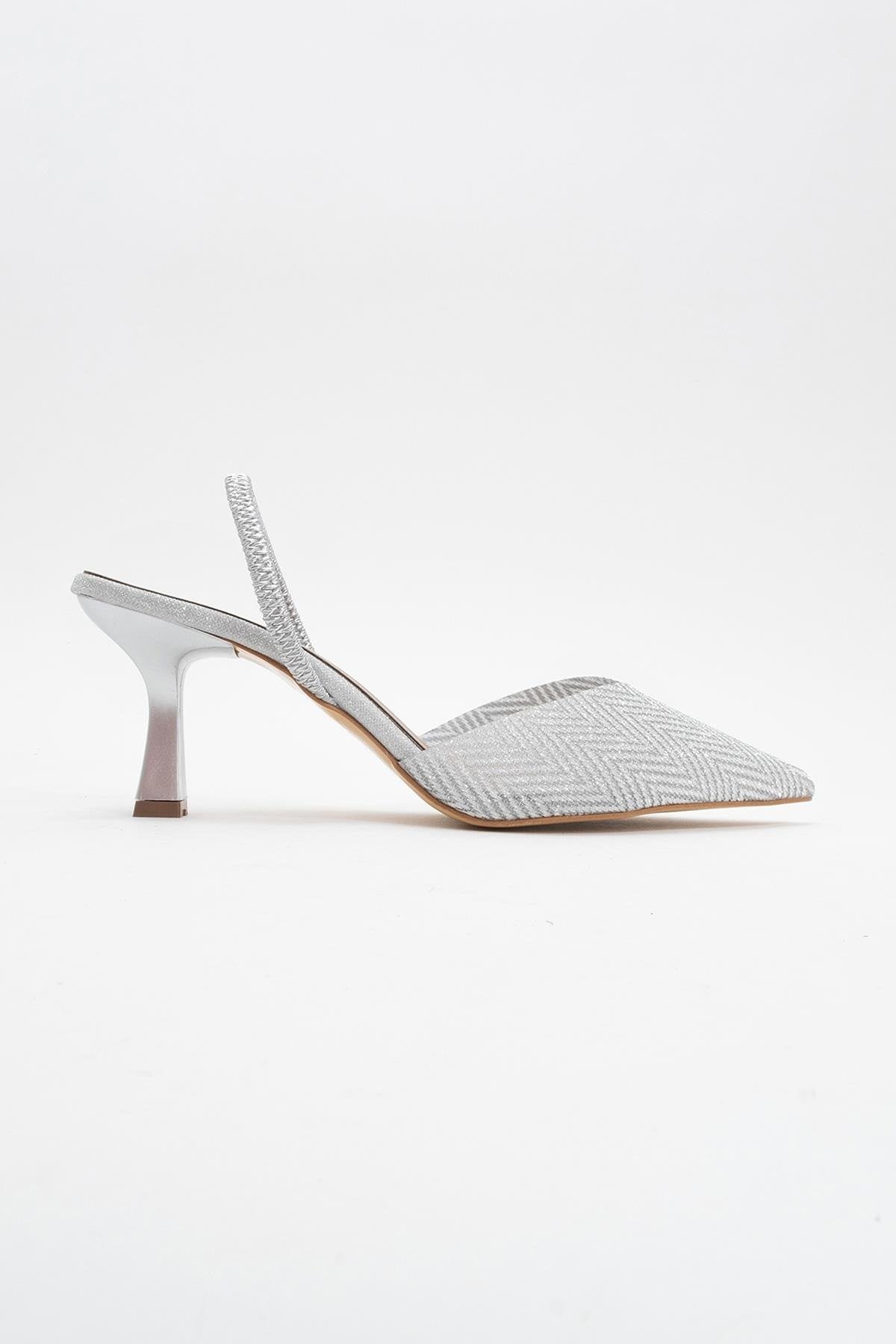 An elegant pointed-toe pump finished in reflective glitter for a statement-making evening look