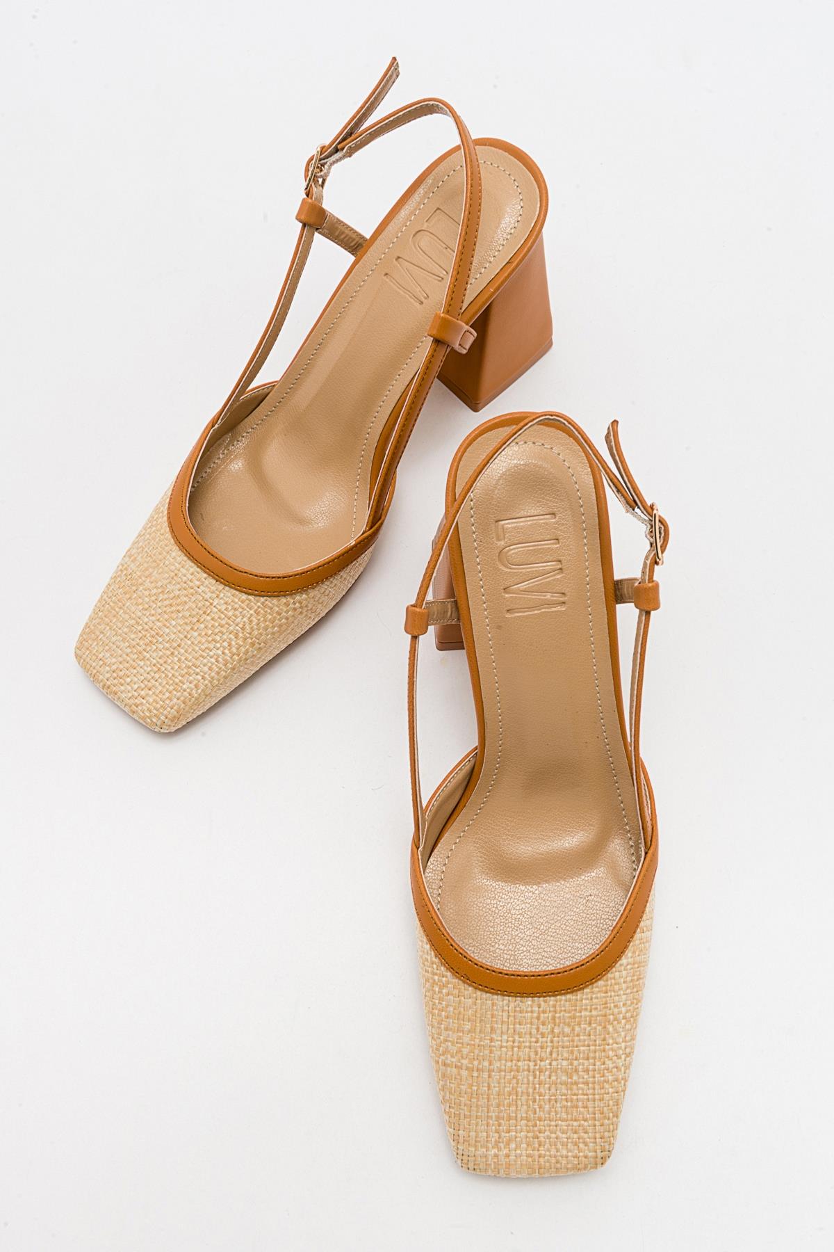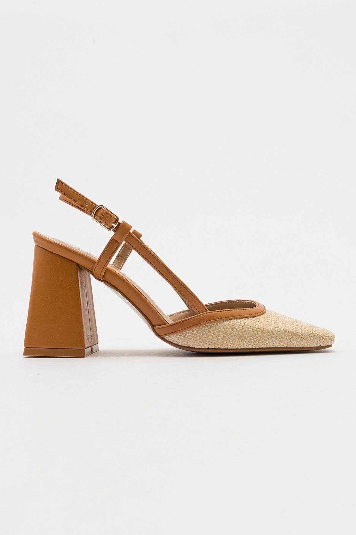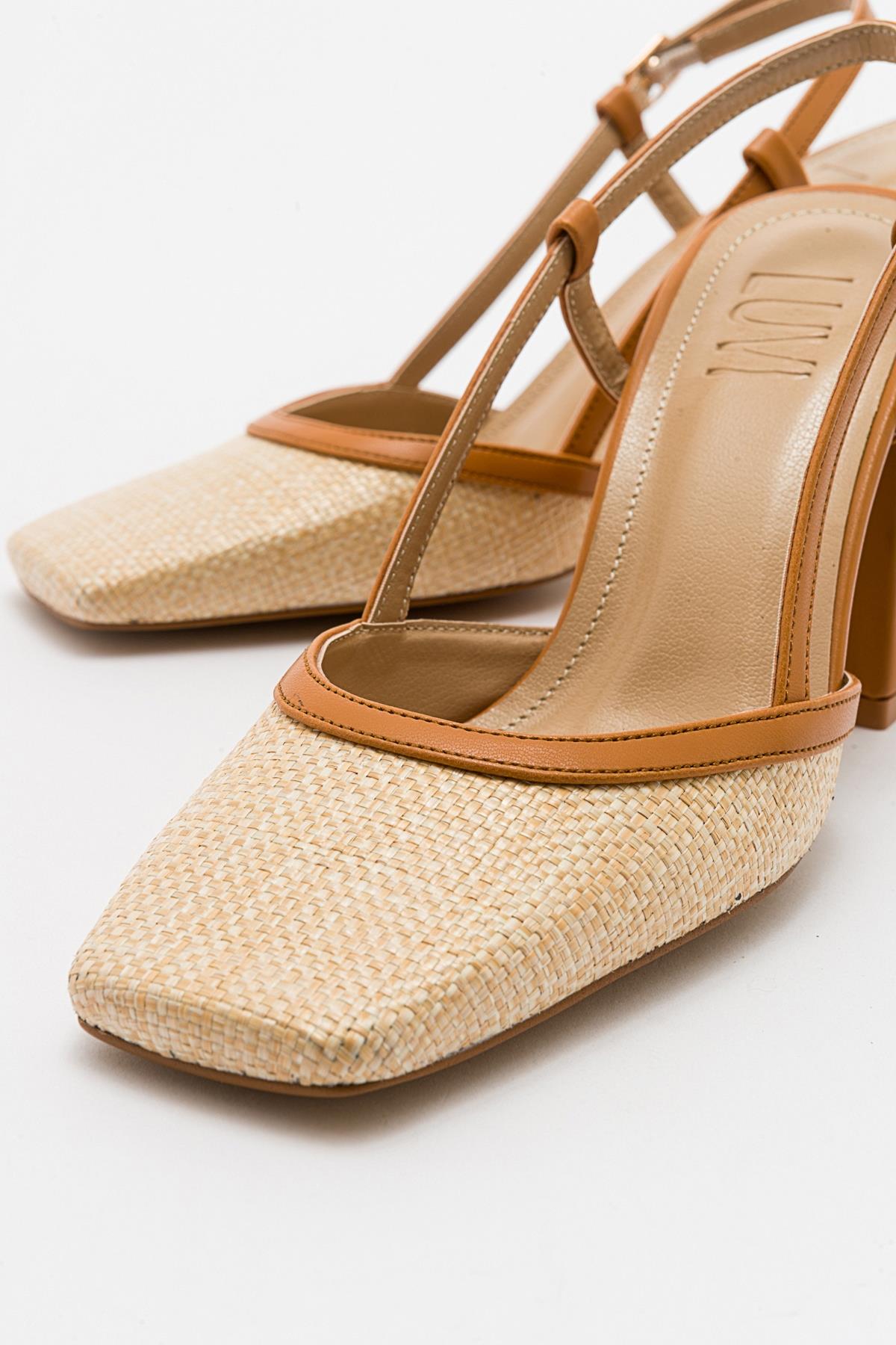 An elegant chunky heel with artisanal texture for modern wardrobes | 3.5" (9 cm) heel | Raffia and synthetic leather upper / synthetic leather lining / neolite sole | Handmade in Turkey, true to size