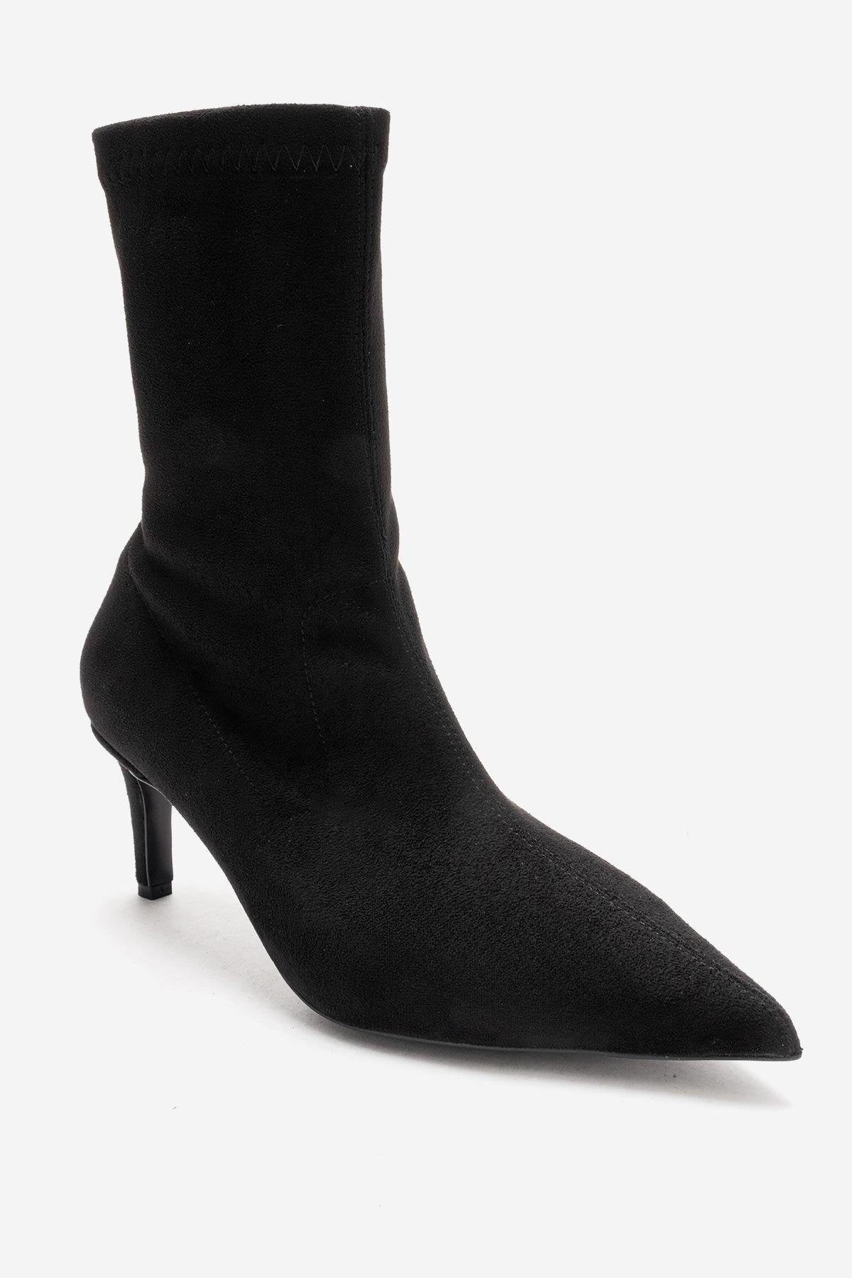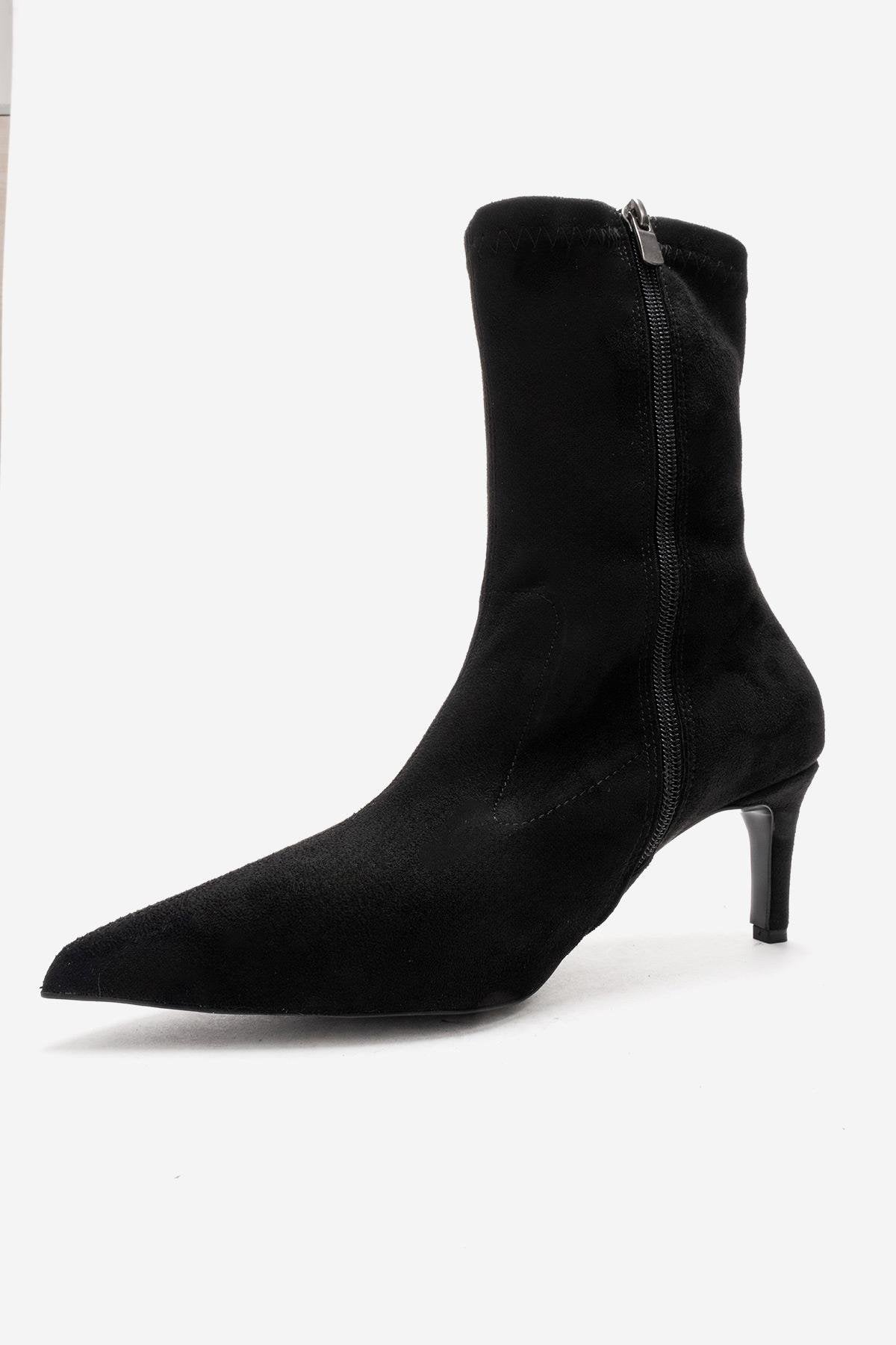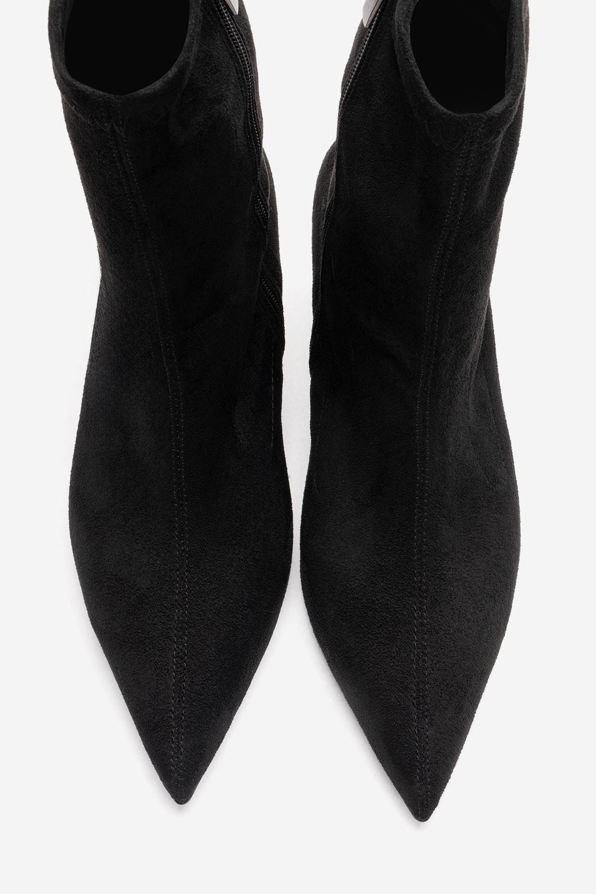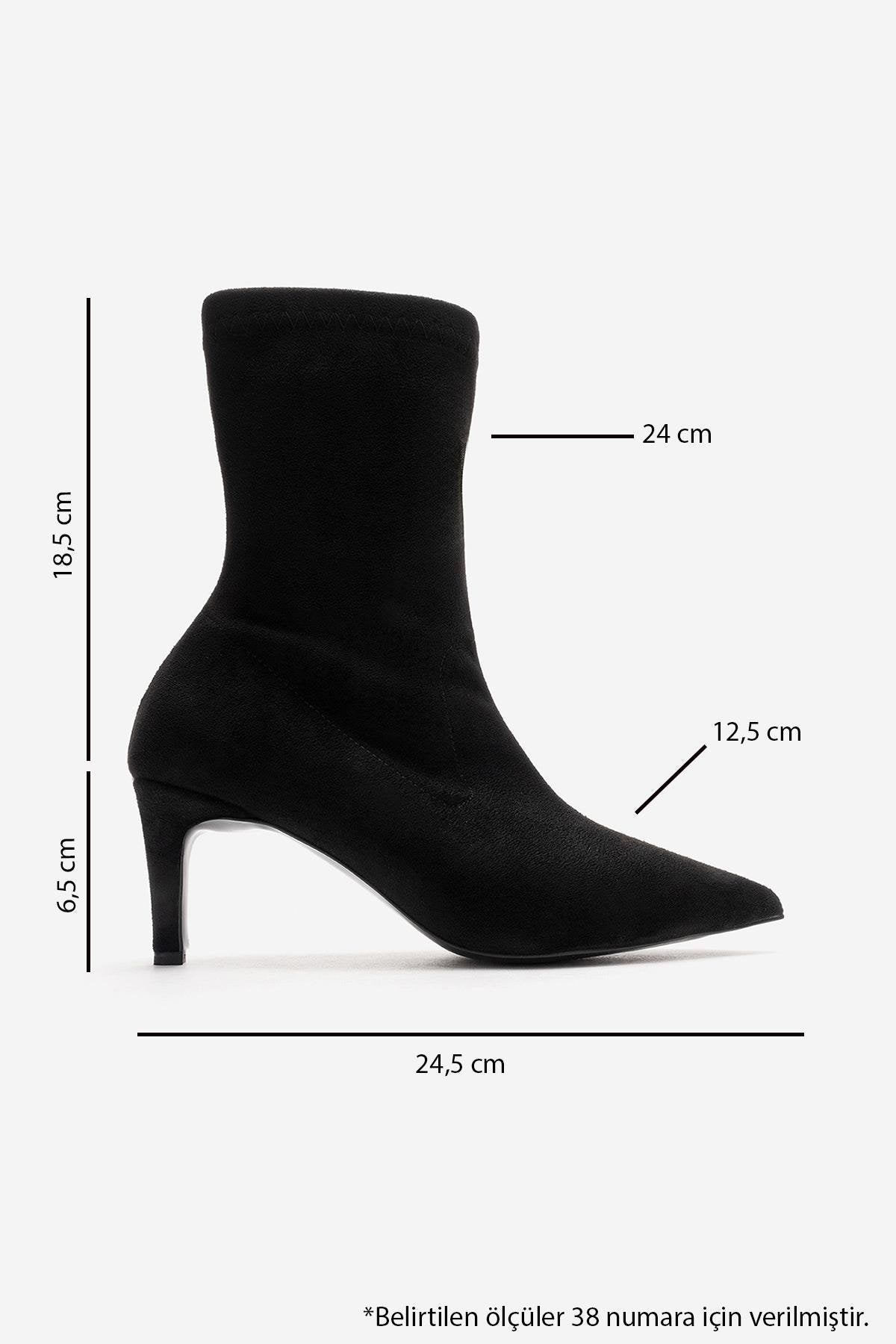 A refined stiletto boot with a velvety suede effect and timeless femininity | 2.5" (6.5 cm) heel | 7.2" (18.5 cm) shaft | 9.4" (24 cm) ankle circumference | 4.9" (12.5 cm) forefoot width | Synthetic suede upper / Textile lining / Neolite sole | Handmade in Turkey, true to size
