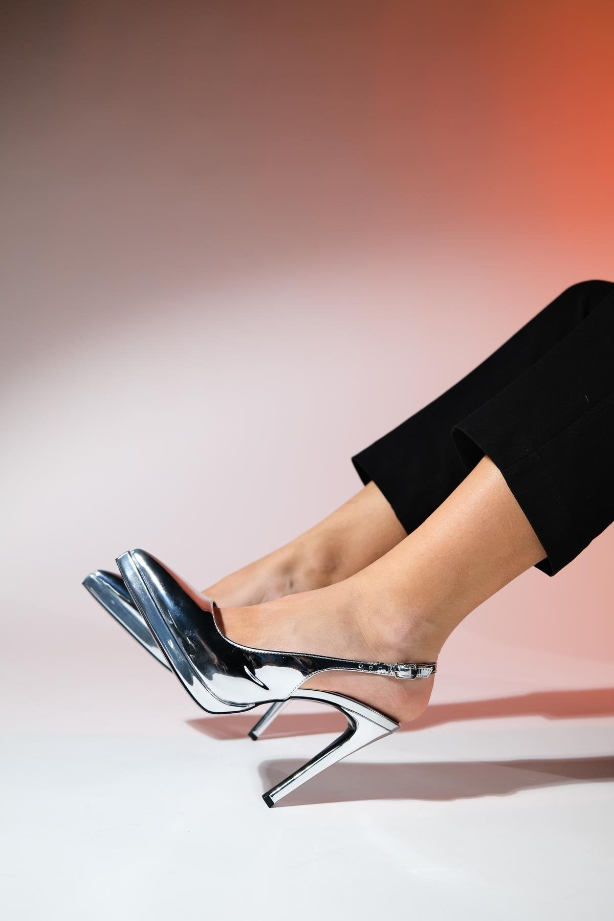 A striking pointed-toe platform heel that pairs modern shine with evening polish