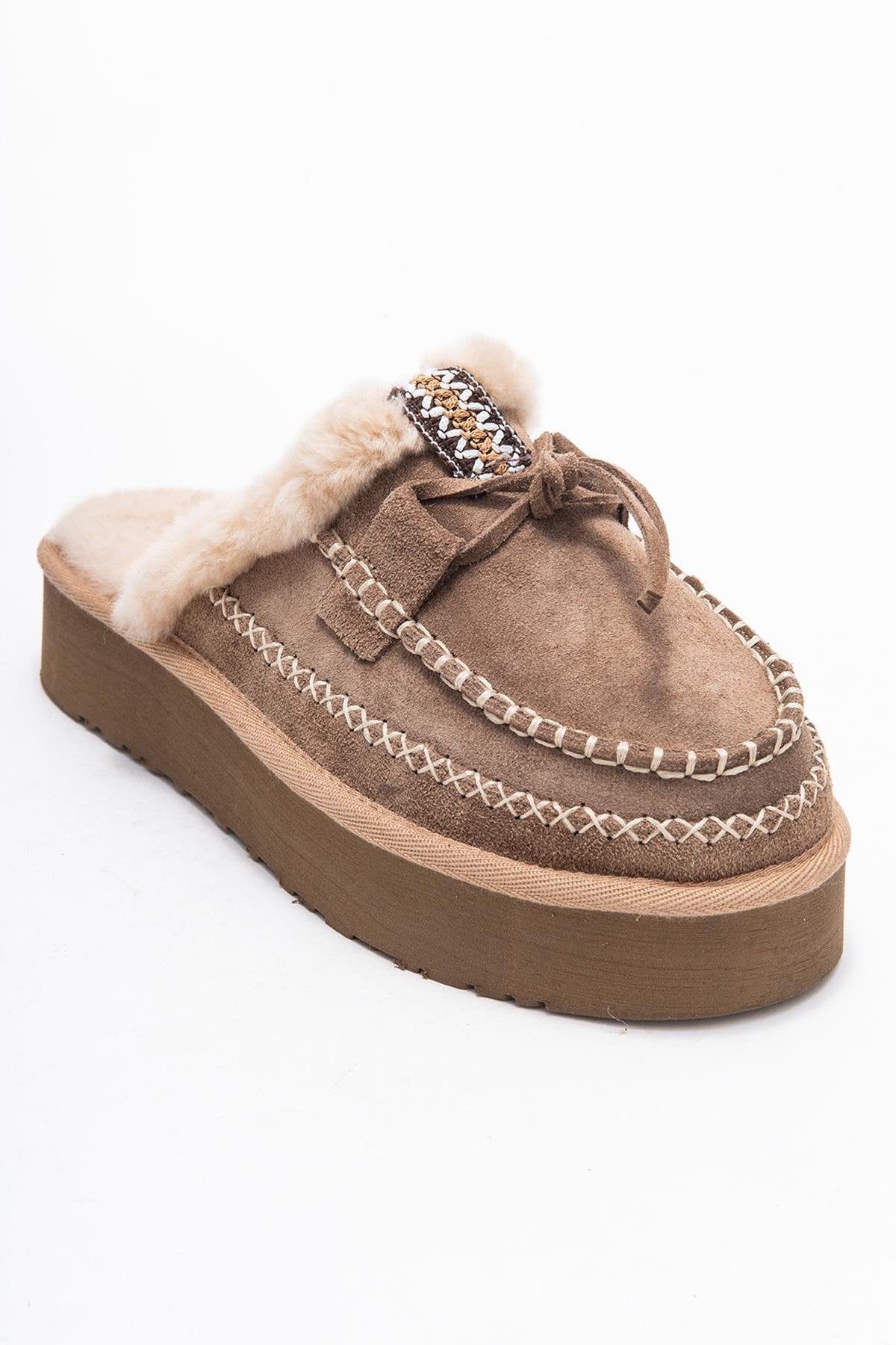 A modern platform moccasin that pairs traditional hand-stitching with plush lining for cozy sophistication
