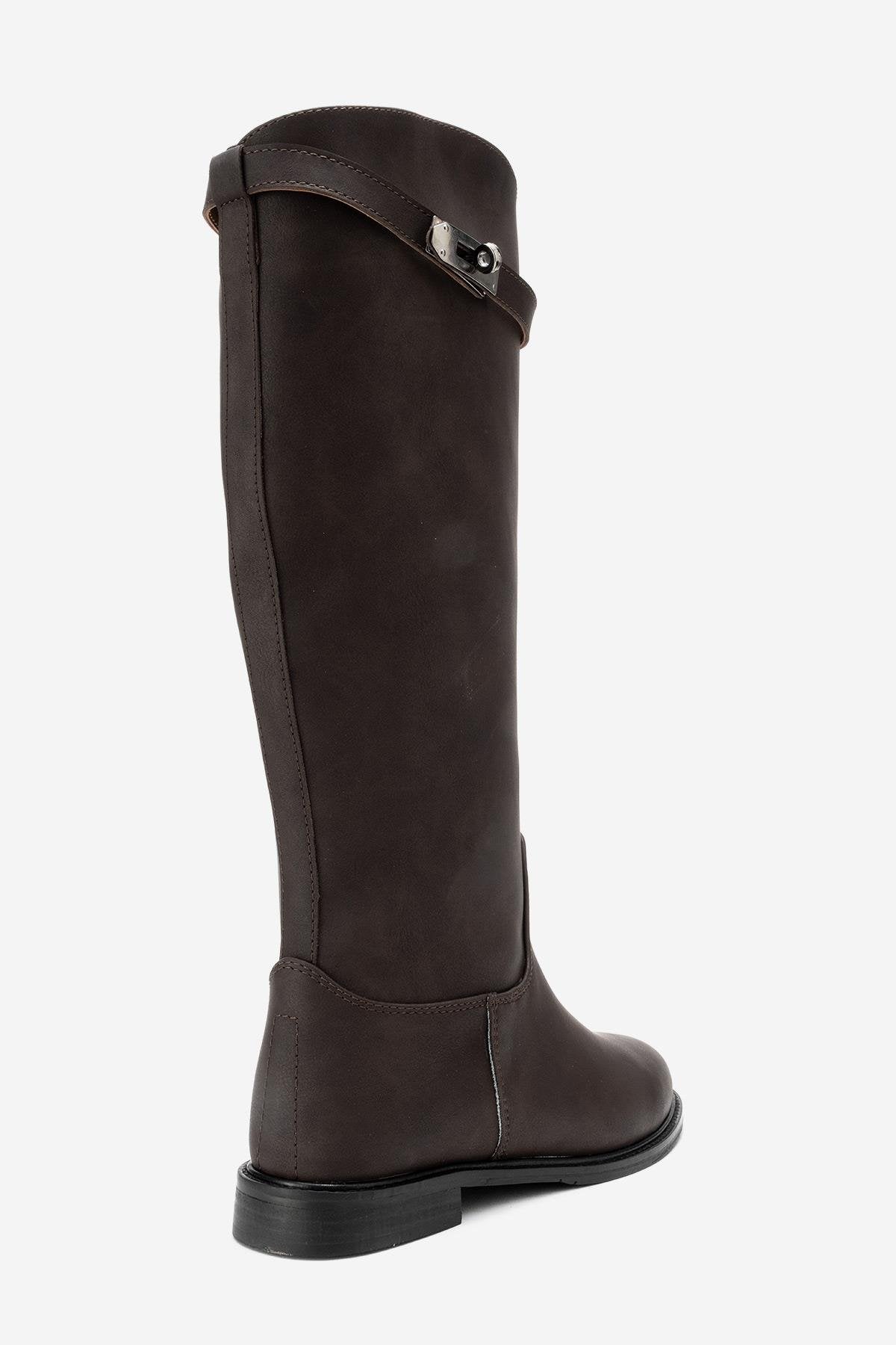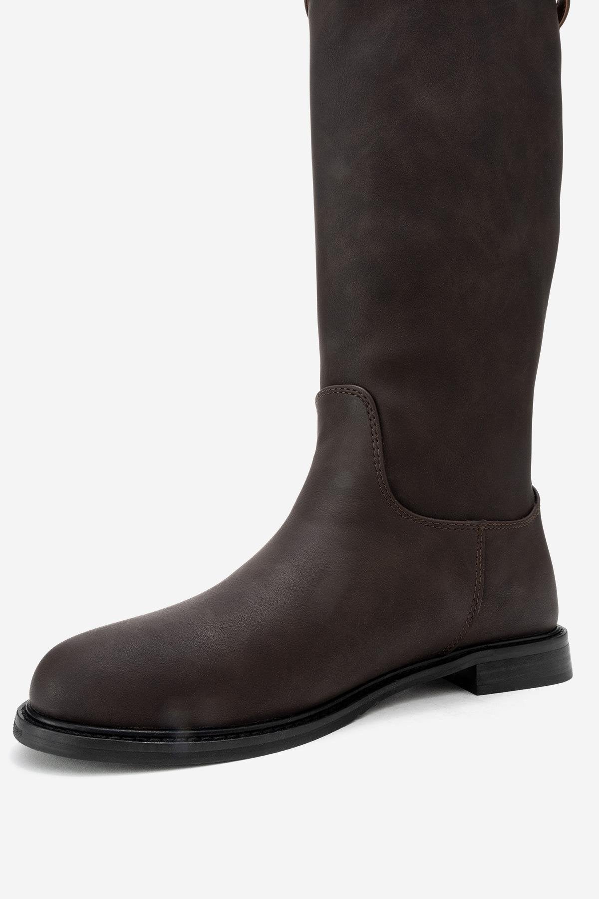 A sleek riding boot with minimalist lines and subtle hardware for effortless urban polish