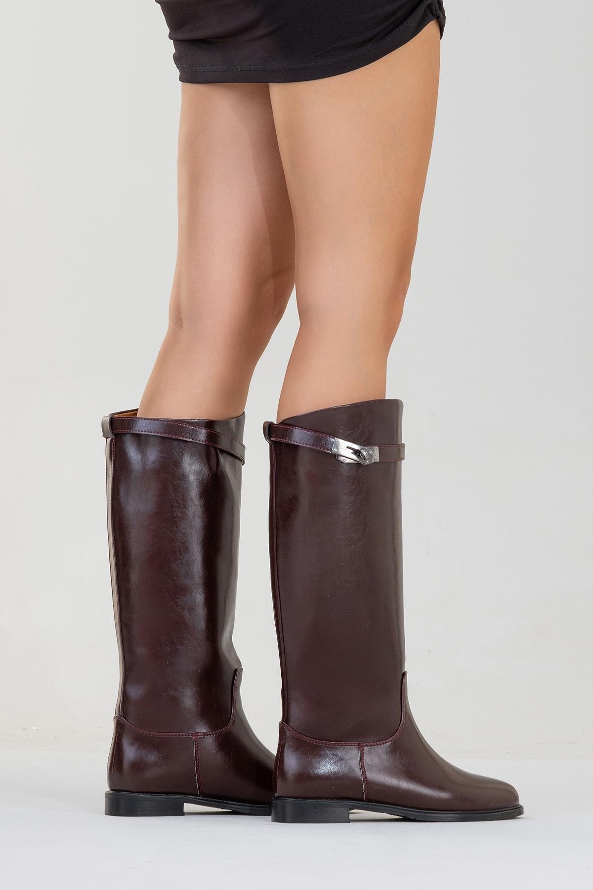 A sleek and sophisticated riding boot featuring a faux-leather upper and a chic buckle detail, designed to elevate your everyday style. 1.0" heel, 15.4" shaft (size 7US) 12.2" circumference (size 7US); slip-on design with buckle accent Synthetic leather upper / warm lining / TPU sole Handmade in Turkey, true to size